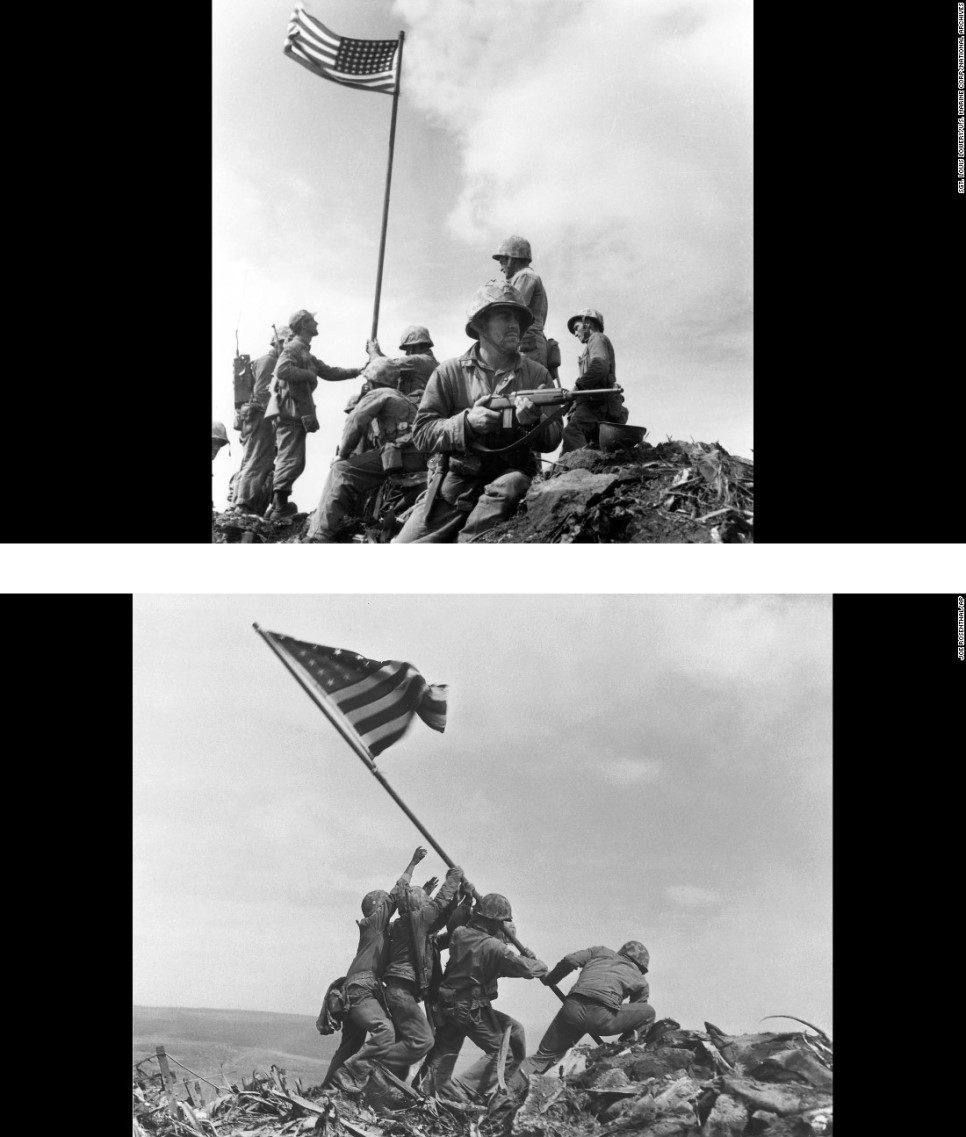 *아래 사진에서 위쪽이 첫 번째로 촬영된 사진(by Louis Lowery). 아래쪽은 퓰리처상을 수상한 두 번째 사진 (by Joe Rosenthal).