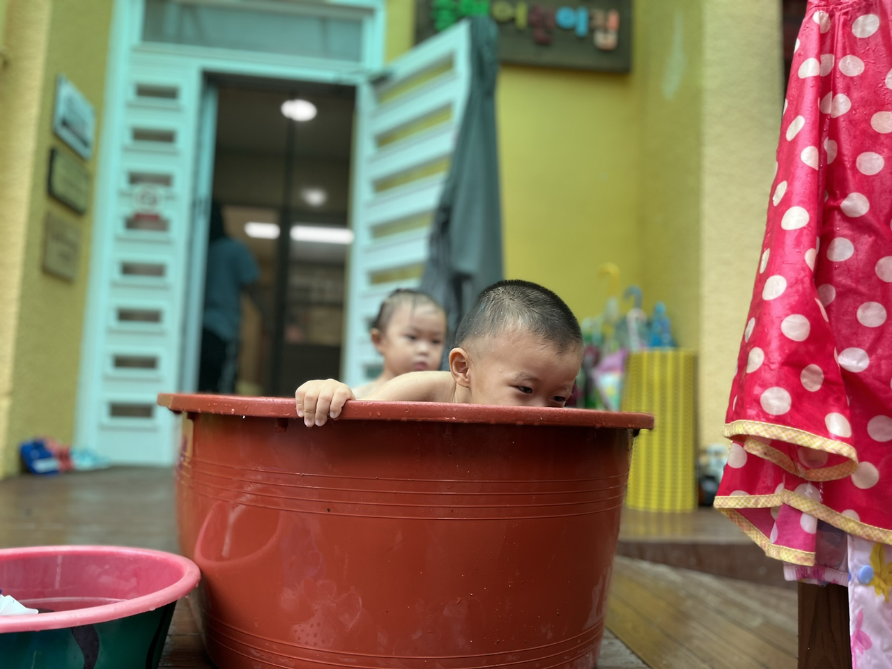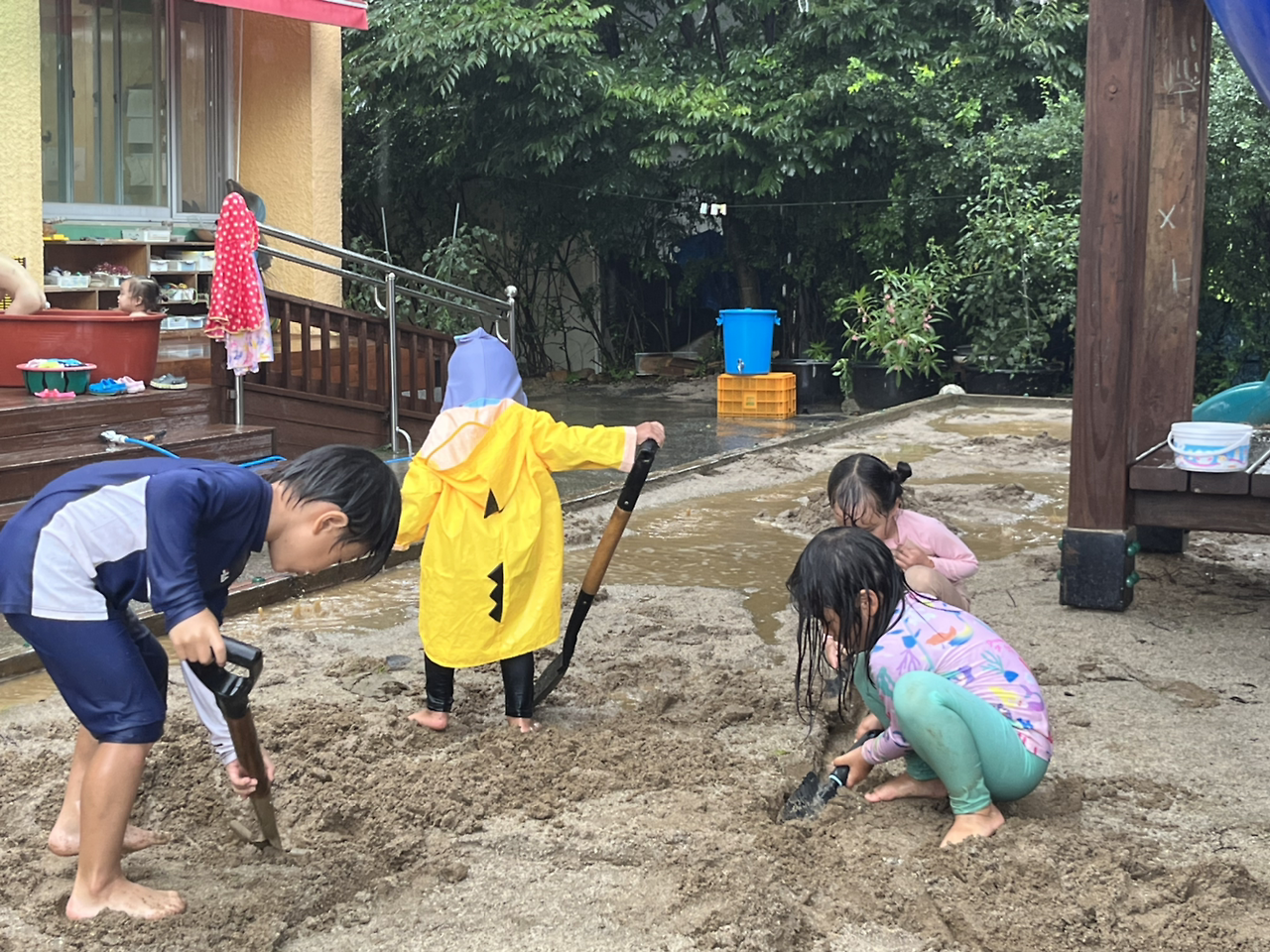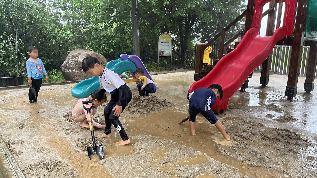 지난 여름 며칠째 비가 내렸다. 아이들은 거센 비에 우비를 입었다가도 몇걸음 못 걷고 돌아와야만 했다. 날은 덥고 장마철 습기가 온 공간을 가득 메웠다. 엉덩이를 들썩 대는 아이들은 밖을 향해 아우성이다. 더이상 실내 놀이가 불가하다고 판단이 될 무렵, 그래 오늘은 '우중 물놀이다!'하고 선생님들이 일치단결 한 목소리를 냈다. 아이들은 수영복을 입은 채로 비오는 마당으로 뛰어 나간다. 처음에는 주춤거리다가 얼굴에 떨어지는 빗물을 맞으며 시원하다 소리친다. 선생님들도 비옷을 입은 채 맨발로 첨벙이기 시작했다. 비가 꽤 내린터라 곳곳에 웅덩이들이 생겼고 웅덩이를 오가는 아이들을 시작으로 물놀이가 본격적으로 시작되었다.