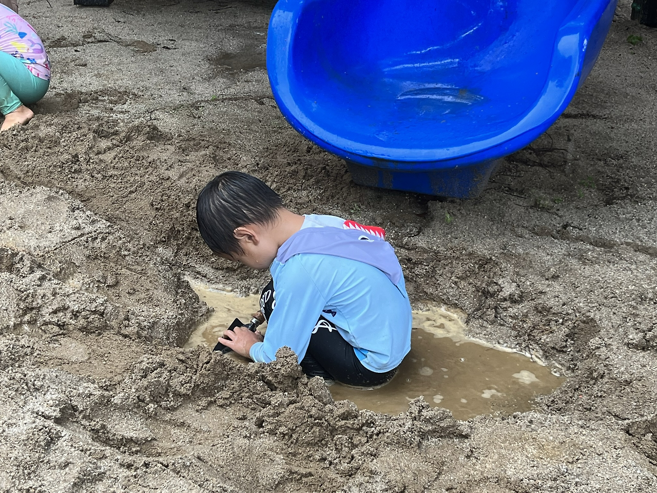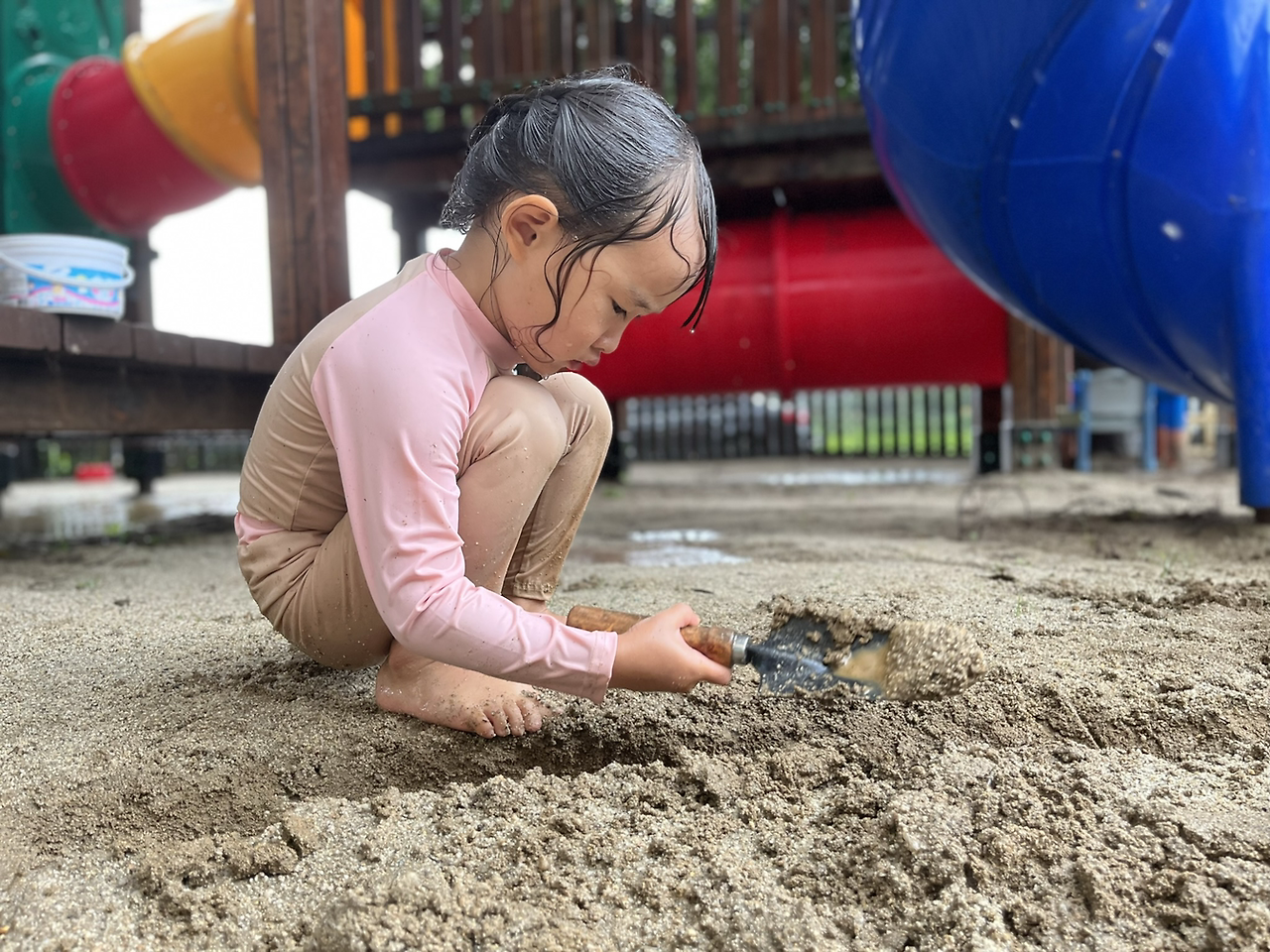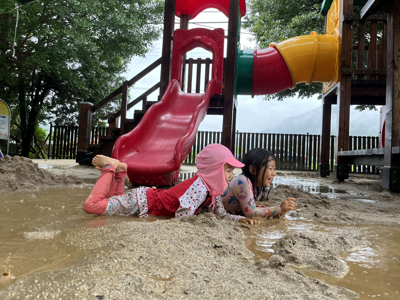 지난 여름 며칠째 비가 내렸다. 아이들은 거센 비에 우비를 입었다가도 몇걸음 못 걷고 돌아와야만 했다. 날은 덥고 장마철 습기가 온 공간을 가득 메웠다. 엉덩이를 들썩 대는 아이들은 밖을 향해 아우성이다. 더이상 실내 놀이가 불가하다고 판단이 될 무렵, 그래 오늘은 '우중 물놀이다!'하고 선생님들이 일치단결 한 목소리를 냈다. 아이들은 수영복을 입은 채로 비오는 마당으로 뛰어 나간다. 처음에는 주춤거리다가 얼굴에 떨어지는 빗물을 맞으며 시원하다 소리친다. 선생님들도 비옷을 입은 채 맨발로 첨벙이기 시작했다. 비가 꽤 내린터라 곳곳에 웅덩이들이 생겼고 웅덩이를 오가는 아이들을 시작으로 물놀이가 본격적으로 시작되었다.