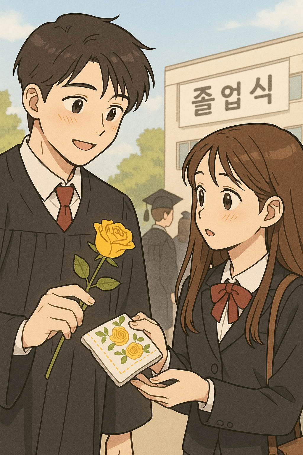 중학교 졸업식 날이었다. 졸업식이 끝나고 한마을 친구와 집으로 향하고 있었다. 나의 동선을 미리 알고 있기라도 한 듯 시장 골목 어귀에서 그와 그의 친구들 여럿이 진을 치듯 내게 다가왔다. 나는 당황스럽기도 하고 수줍어 고개를 푹 숙였다. 나와 마주한 그는 조화로 만든 노란 장미 한 송이와 분홍 장미가 곱게 물든 손수건을 내게 내밀었다. 그도 쑥스러운 듯 “졸업 축하해!” 한마디만 뱉고는 아무 말도 못 했다. 나 역시 “고마워” 대답만 하고는 얼떨결에 그것을 받았다. 무슨 말이라도 하면 좋으련만 머릿속은 하얘지고 같이 기념사진이라도 찍자는 말은 입안에서 맴돌 뿐이었다. 참 어색하고 짧은 만남이었다. 장난치고 할 때와는 다르게 그의 얼굴을 마주 대하는 것이 점점 부끄러웠다.