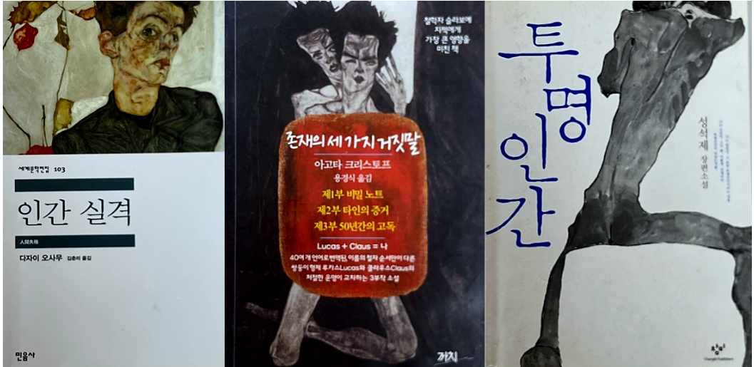 그의 많은 작품에서 왜곡되고 뒤틀린 형태의 인물묘사는 인간내면의 관능적 욕구와 불안과 의심을 반영하고 있다. 책의 내용을 관통하는 이미지를 함축적으로 표현하는 이미지가 책 표지라면 에곤 실레의 작품 표지 책들은 우리가 바라보지 못했던 인간의 욕망과 본능을 가감 없이 쓴 글들이었다. 이런 생각의 근거는 놀랍게도 내가 좋아하는 도서리스트에 무려 3개의 책에서 에곤실레의 작품이 자리를 잡고 있었기 때문이다.