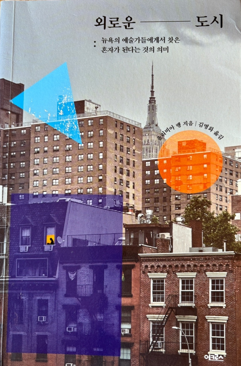 ' 외로운ㅡ도시'라는 책은 외로운 하고 길게 띄어쓰기된 바가 인상 깊었다. 저 긴 공백이 계속 끌어당기는 느낌이랄까? 회색의 도시 사진을 배경위에 오렌지, 블루, 바이올렛색 컬러로 다른 모형들이 투명하게 겹쳐져 있다. 잿빛의 외로운 도시에 다양한 삶을 색으로 표현한 거라 생각이 들었다. 표지 아래쪽의 건물 위 보라색 투명사각 틀 안에 있는 검은 실루엣은 뉴욕의 예술가중의 한 명을 표현하는 것으로 보인다. 혹은 수많은 예술가들의 외로움이 전이된 작가의 모습일지도 모르겠다, 가장 세련되고 예술적 감성이 한데 어울린 도시, 누구나 한 번쯤은 꿈꾸는 도시의 외로움은 어떨까?