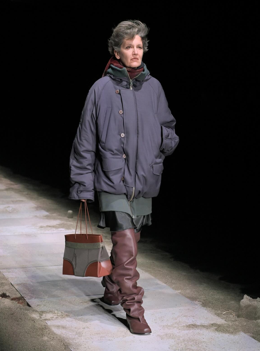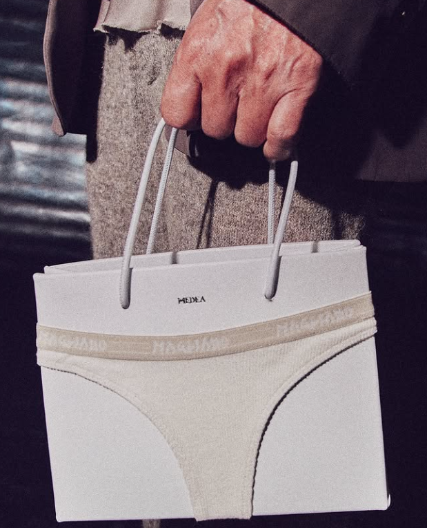 일반적으로 속옷은 다른 이에게 쉽게 보여주지 않지만 이 무대에서는 달랐다. 가방이 팬티를 입은 채 런웨이를 활보했다. 이탈리아의 브랜드 '말리아노'의 2025FW 컬렉션에서 선보인 이 제품은 쇼핑백 형태의 가방에 톤온톤 컬러의 팬티를 입혀 속옷이 보일 듯 말한 조화를 만들어냈다. 말리아노는 1980년대 이탈리아 반문화적 성향에서 영감을 받은 브랜드로 세련되고 경박한 매력을 동시에 지녔다는 평을 받고 있다.