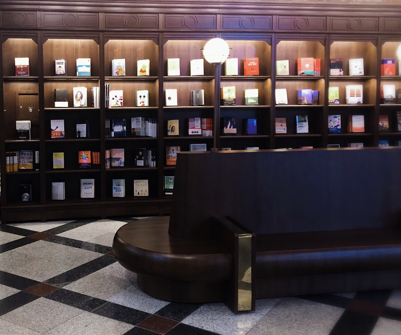 밖에서 내부가 보이는 구조, 서점에 들어섰을 때 적당히 낮은 조도와 다크 컬러의 클래식한 우드책장은 몰래 아빠서재에 들어간듯한 두근거림과 아치 형태의 통로 끝에 무엇이 있을지에 대한 설레임 그리고 정리되지 않은 듯 배열되어있는 책들과 굿즈들까지책의 너무 뻔하지 않은 배열과 등장은 내게 익숙해서 단조로운 일상에서 새로워서 편안한 퇴근길 놀이터가 되었다.