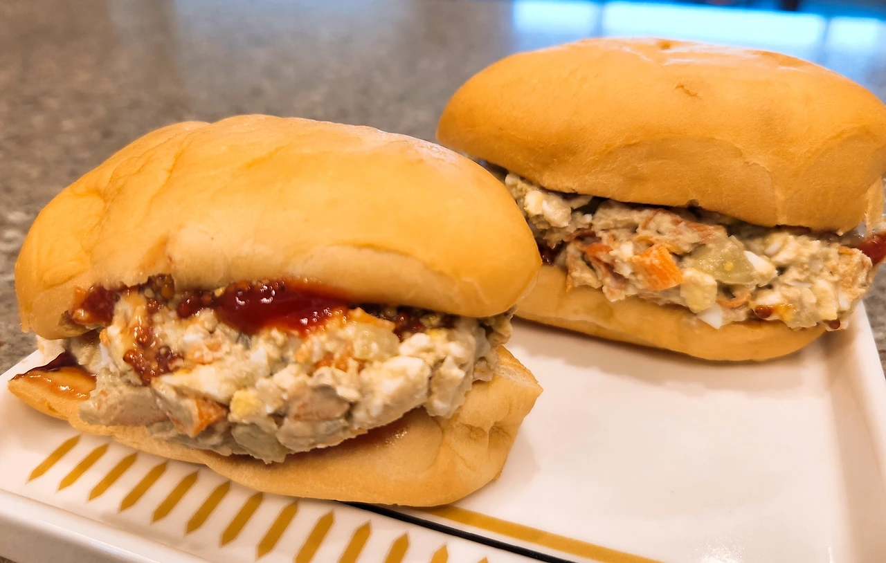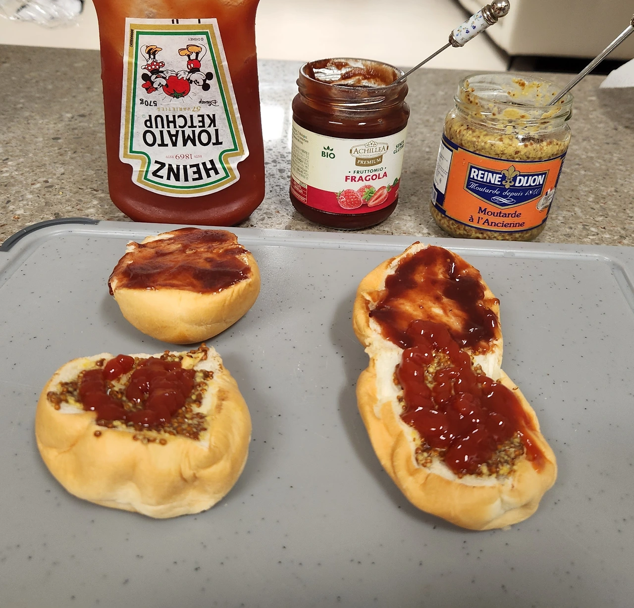 모닝빵을 반으로 갈라 한쪽에는 홀그레인 머스터드와 케첩, 다른 한쪽에는 딸기잼을 바르고 정성스레 만든 계란 샐러드를 넣어주면 완성이다. 케첩과 잼은 단짠을 위한 최고의 짝꿍이다.