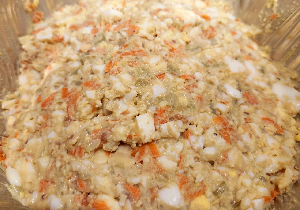 계란이 다 삶아지면 찬물에 담근 후 껍질을 까고 큰 보울에 넣어 포크로 뭉개 주면서 소금, 후추, 마요네즈를 넣어 섞어준다. 여기에 준비해 놓은 오이, 당근, 호두를 넣어 슥슥 비벼주면 계란 샐러드가 완성된다.