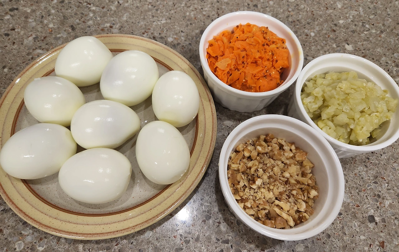 우선 계란을 삶고, 그동안 오이피클과 당근 라페를 다져 거즈로 물기를 빼고 호두도 작게 빻아준다.