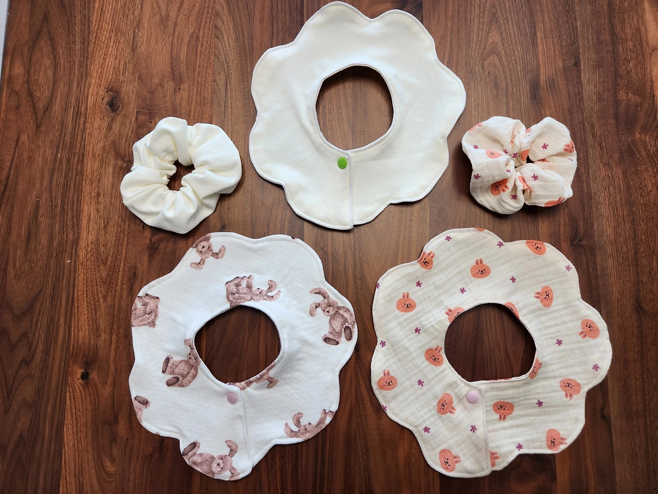 문화센터에서 아기 옷 만들기에 들어간 후부터는 집에 와서 아기 턱받이를 만드는데 여념이 없었다. 센터에서 배운 것에 더해 유튜브나 블로그를 보고 쿠션이나 머리끈 등을 만들기도 하고 스스로 조금씩 변형해 가며 나만의 작품을 만들기 시작했다. 이렇게 하루에도 몇 시간씩 재봉틀을 돌리다 보니 자세가 구부정해지고 몇 시간이 지나도록 자리에서 일어나지 않는 경우가 생겼다. 이러다가는 내 몸에도, 아기에게도 무리가 가겠다 싶어 이제는 하루에 두 시간 이상은 하지 않으려고 노력하면서도 여전히 재미있게 작품을 만들고 있다.
