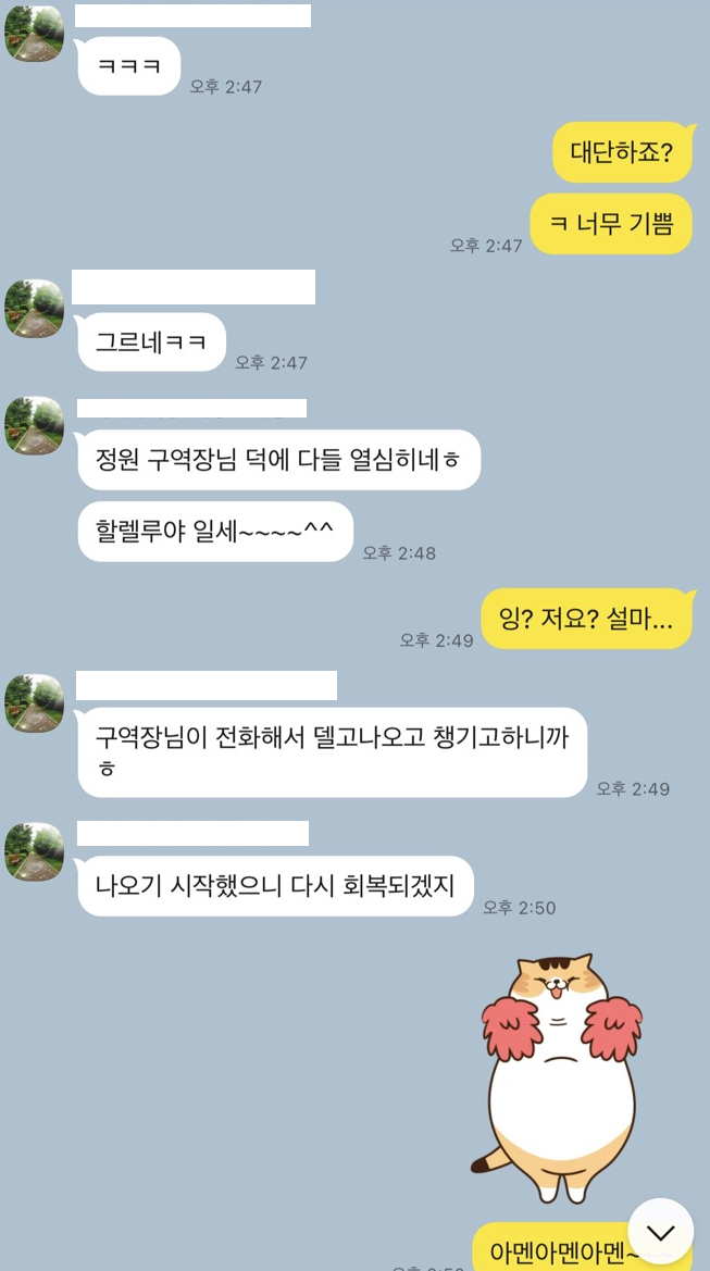 "우리 정원 구역장님이 함께 기도해줘서 고마워서...."