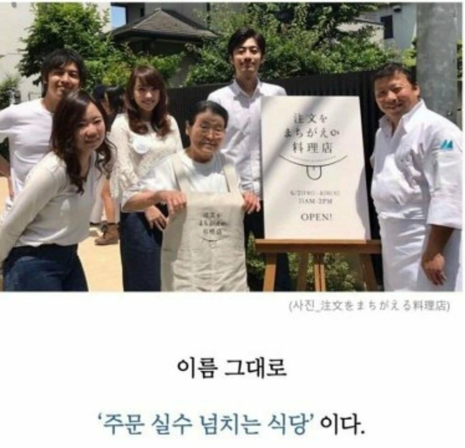 그런데 일본에서는 손님의 주문 실수가 아니라 종업원의 실수로 주문한 것과 전혀 다른 메뉴가 나오는 식당이 있다. 종업원들 전부가 치매 할머니인데 이 식당의 이름이 바로 '주문 실수가 넘치는 식당'이다. 그런데 엉뚱한 음식이 나오고 실수해도 화를 내거나 불쾌해하는 손님은 없다. 손님들은 웃으며 할머니들을 배려하고 오히려 어떤 음식이 나올지 기대한다.