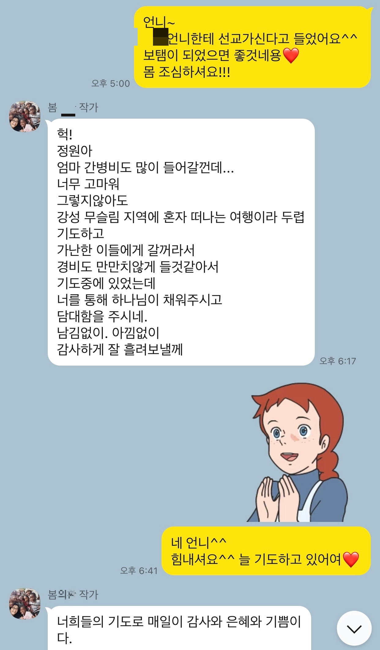 봄작가님이 7/31-8/14 혼자서 무슬림지역으로 선교를 갈 계획인데.