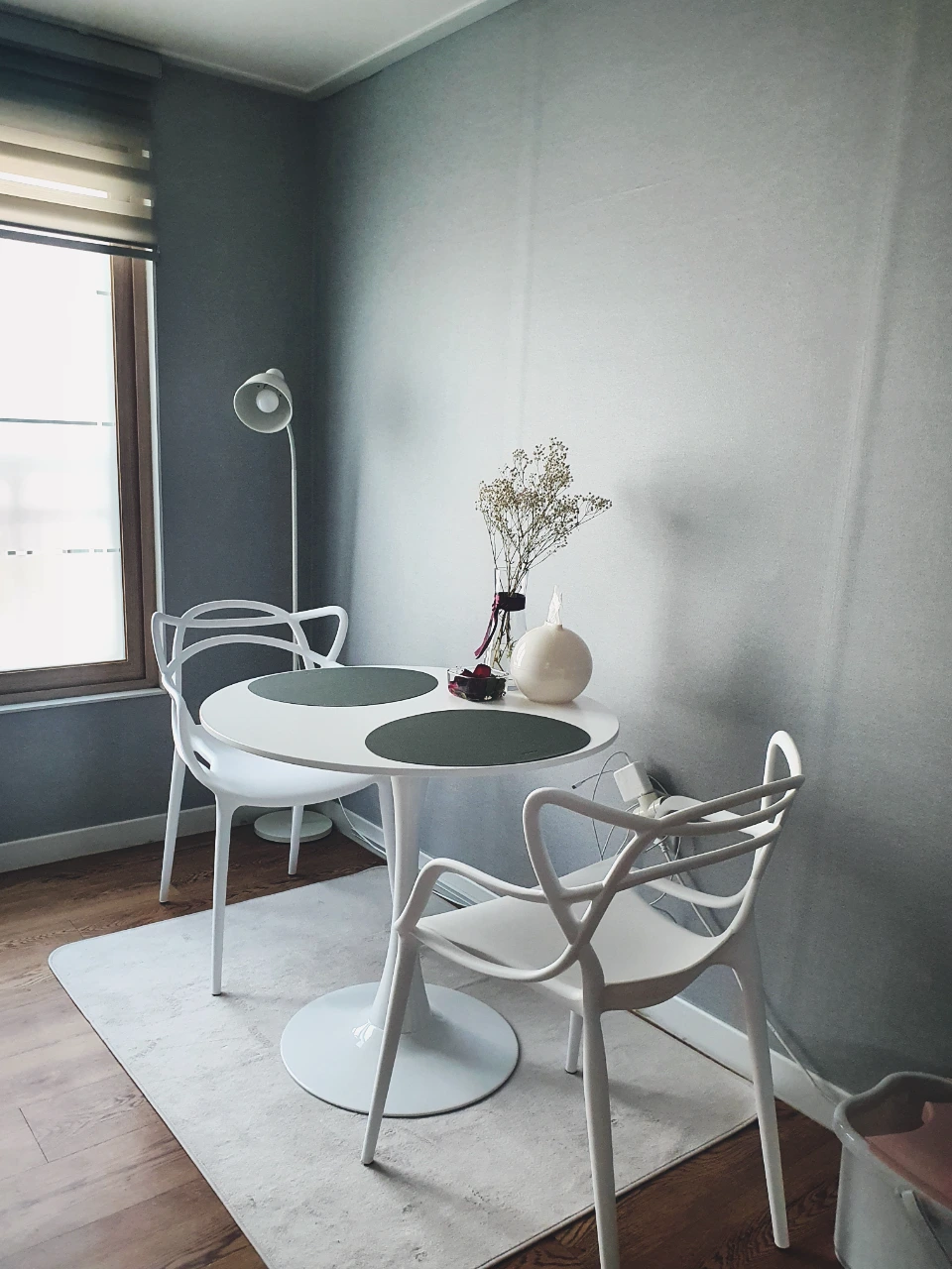 4) 하얀색 예쁜 원형 테이블과 아트 체어 2개, 접이식 의자 2개(다 밥 먹고 살자며 하는 짓... 접이식 의자는 좁은 공간에서 평소엔 접어 뒀다가 지인들이 왔을 때 쓰고자 구매...)→ 남친의 이사 기념 선물. thanks!