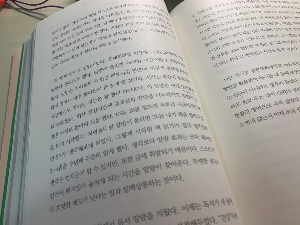 두 번째가 바로 알람이었다. 휴대전화를 이용해 12:30, 20:30에 매일 알람이 울리도록 했다. 알람이 울리면 '독서할 시간'이라고 생각하기로 했다. 알람은 여러분도 꼭 한 번 해보시길 권한다. 이렇게 설정해두면 알람이 얼마나 자주 울리는지 곧 알게 될 것이다. (중략) 생각보다 알람 효과는 크다. 왜냐면 생각은 언제든지 할 수 있지만, 또한 금세 휘발되기 때문이다. 스스로 무언가에 빠져있다 놓치게 되는 시간을 알람이 찾아준다. 뚜렷한 생각보다 흐릿한 메모가 낫다는 말과 일맥상통하는 것이다.