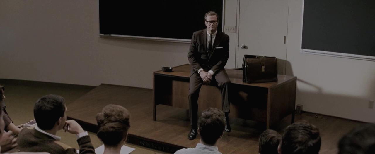 콜린 퍼스가 연기하는 주인공 조지의 강의 장면은 싱글맨에서 가장 많이 언급된다. 비주얼은 영화의 감독이자 구찌 수석 디자이너 출신 톰포드의 스타일링과 콜린 퍼스의 호리호리한 몸매가 어우러져 완성됐다. 가방-안경-구두 책상과 포즈까지 감독이자 스타일리스트인 톰포드의 손이 거쳐가지 않았을 리가 없을. 이를 위해 톰 포드는 콜린 퍼스에게 다이어트를 제안하며 트레이너까지 보내겠다 했다고 한다. 아무튼 이 장면은 안목이 없는 사람에게도 세련되고 감각적인 비주얼을 보여준다.