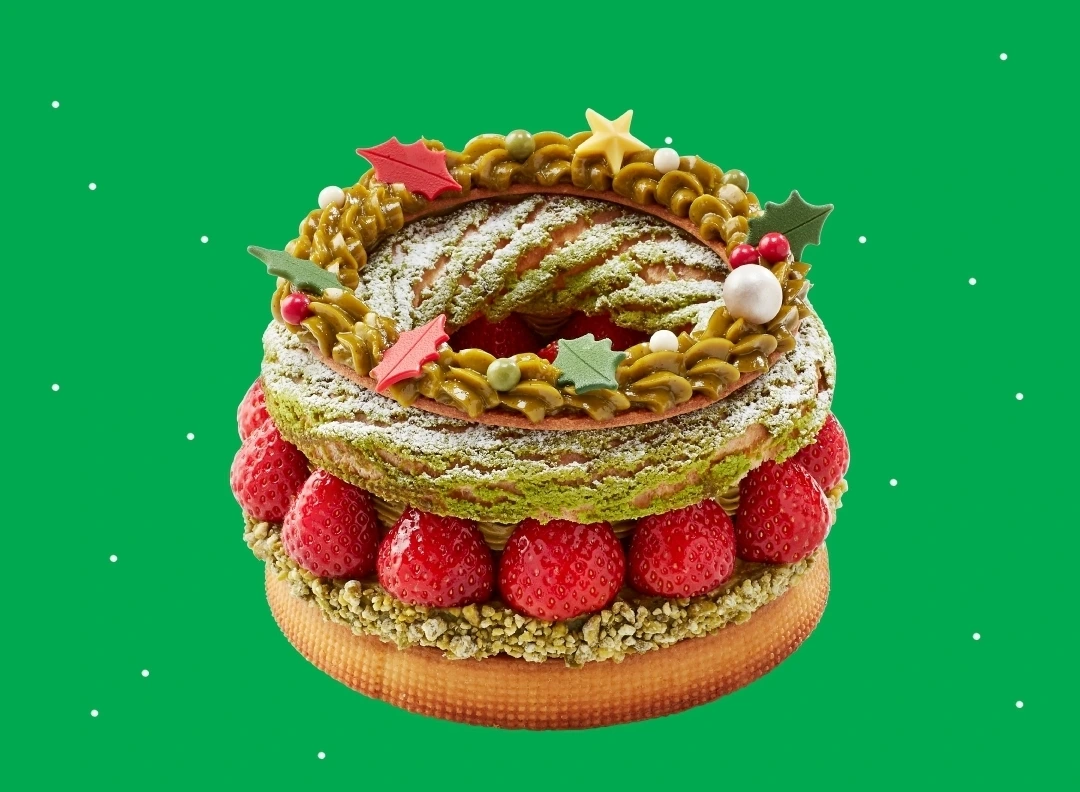 바삭한 페스츄리 트리 안엔 부드러운 밤 앙금이 가득하고 살짝 코팅된 녹색 리스 사이에선 피스타치오 무스와 딸기가 멋진 콜라보를 펼친다.
