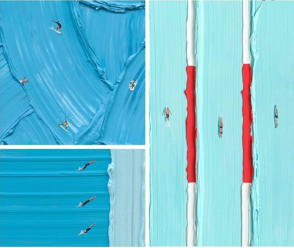 피크닉을 하거나 물놀이를 하고 자전거, 스키 등 스포츠를 즐기는 사람들이 각기 다르게 평화로워서 가만히 그 여러 모습들을 살펴보게 된다. 우리 일상 속 여유라 부르는 순간들이다.