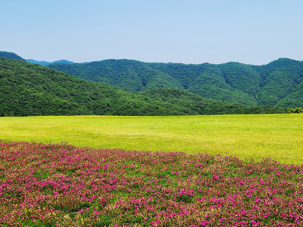 산수화처럼 병풍처럼 펼쳐진 산이 시야를 꽉 채웠다. 양탄자를 깔아놓은 듯 풀밭 위를 수놓은 진분홍