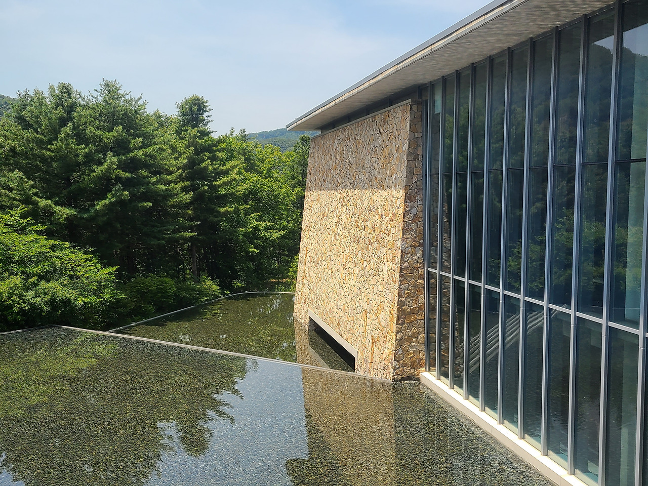 전시가 열리고 있다. 햇빛, 물, 바람 등 자연을 품은 건축을 선보여 왔던 안도 타다오답게 뮤지엄 산 본관 주변은 심플하지만 존재감을 발하는 건물과 건물 주변을 감싼 채 풍광을