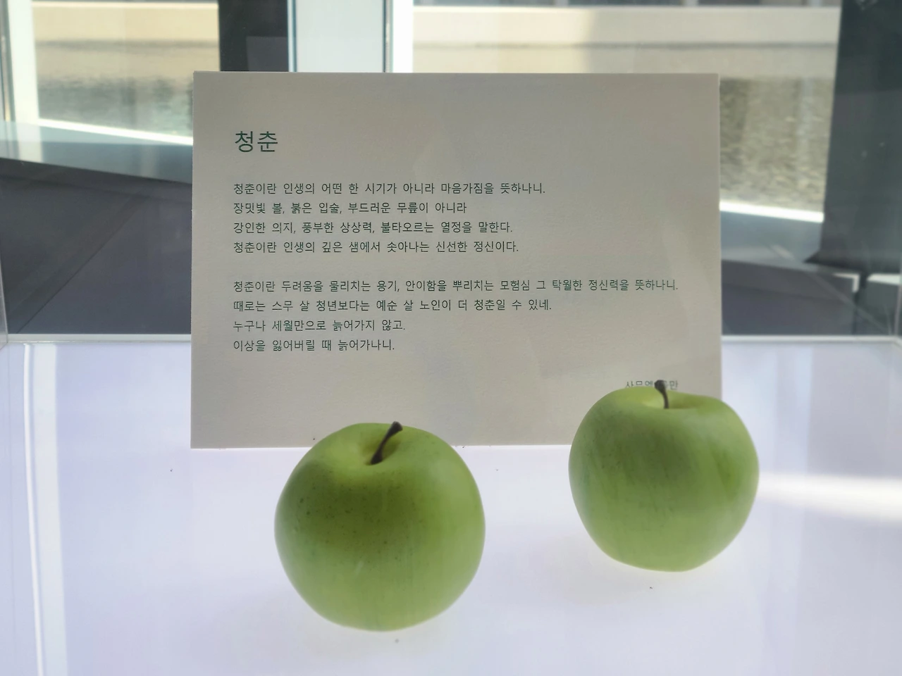 전시관 입구부터 중간중간 보이는 '청춘'이라는 이름의 크고 작은 청사과들도 청춘이 숫자가 아닌 마음가짐이며 누구에게나 현재진행형임을 상기시킨다. 청춘은 10대~20대일 뿐이며 어쩌면