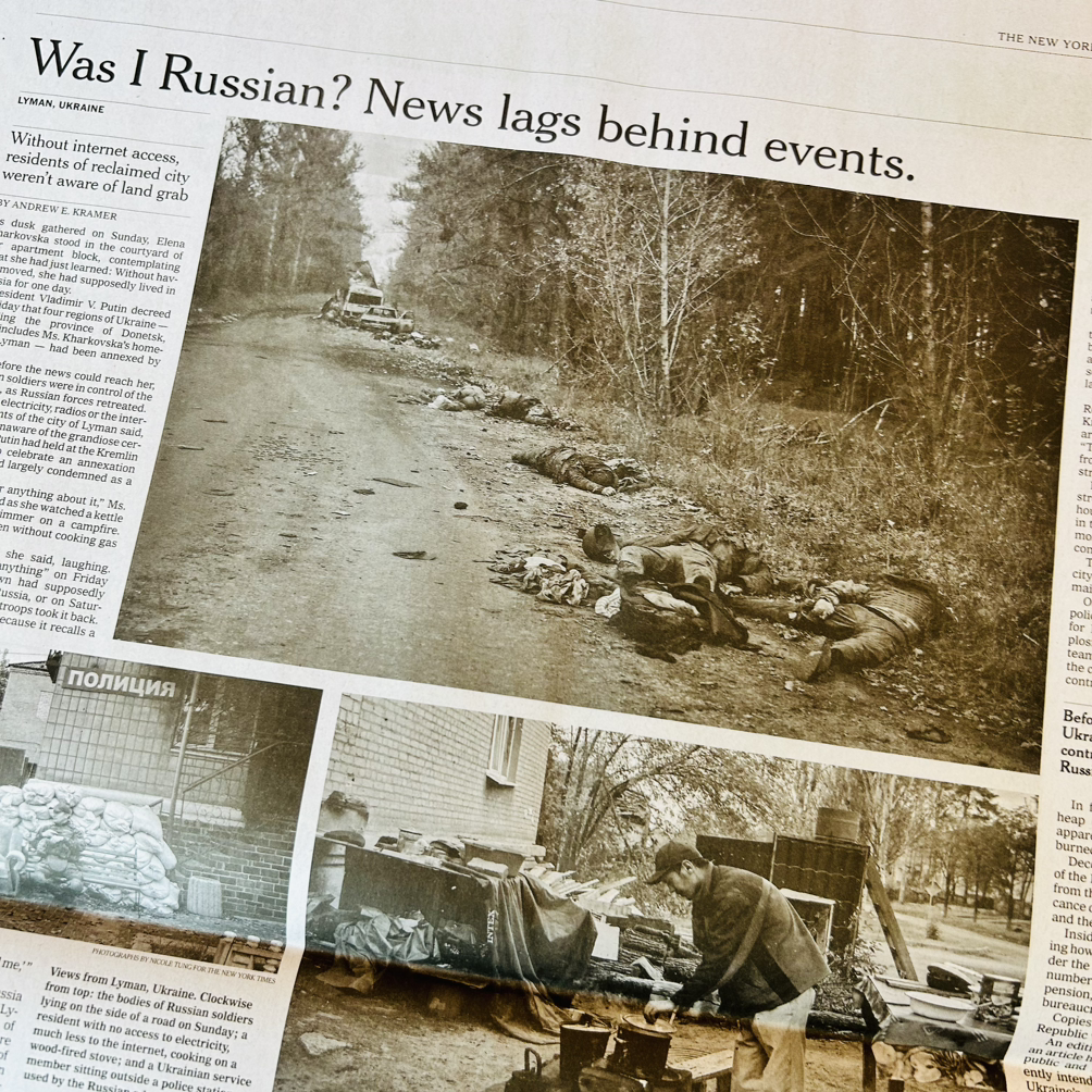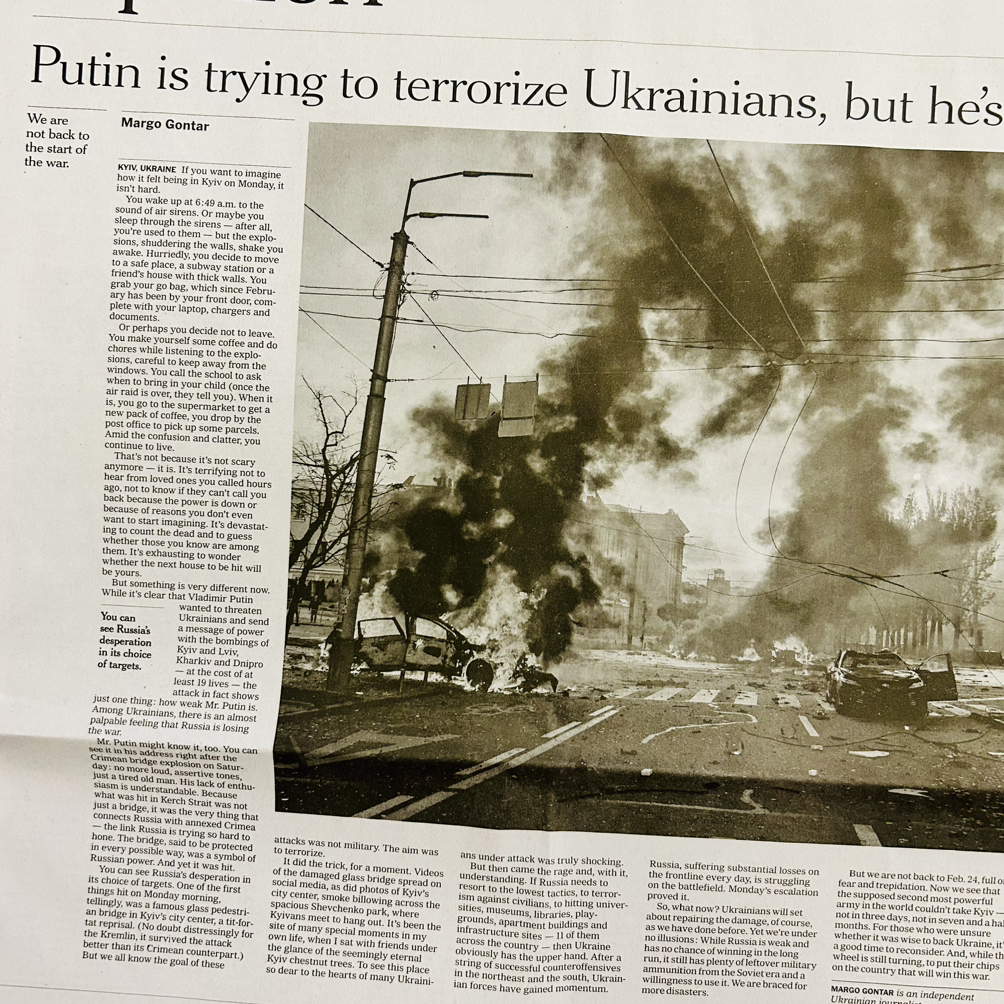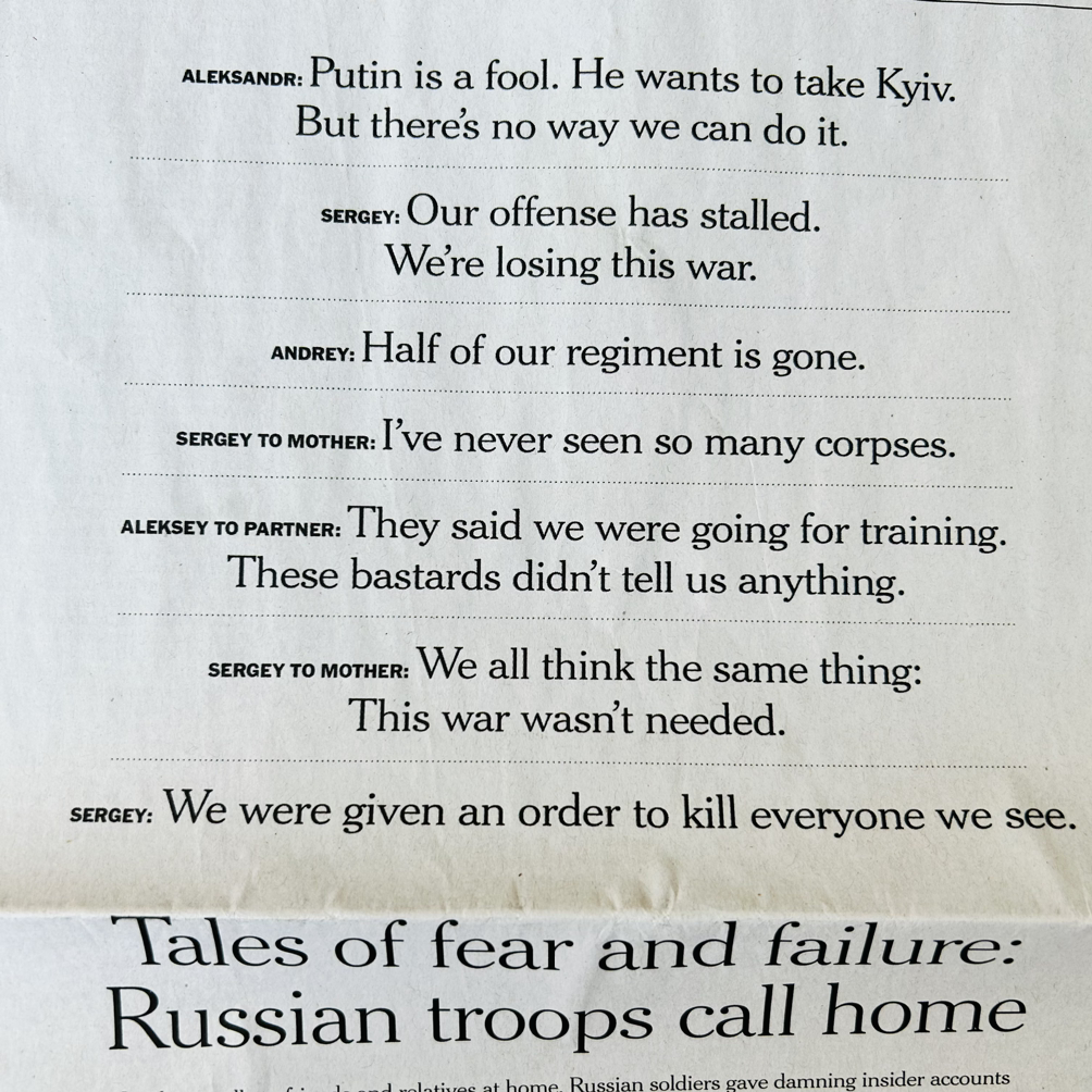 사방에서 총알이 날아와. 모두가 슬퍼한다. 구해줘. 병원 침대가 없어. 다리가 사라졌어. 그래도 살아 있어. 팔이 없어. 그래도 식사를 해. 일본에서 놀러 오래. 공포는 쇼가 되고 레슬러는 대통령을 꿈꾼다. 우간다의 축제와 다시 불타오를 펜데믹. 페이스북은 뇌를 부수고 뉴욕타임스는 광고영업을 해. 시진핑은 건재하고 이란에선 더 많은 여자들이 죽어. 우크라이나를 불태우는 푸틴이라는 가미가제. 부상병과 붕괴된 도시, 허물어진 집, 버려진 시체들. 살아남은 군인들은 허기를 채우고 살아남은 할머니는 포옹을 한다.