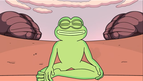 *다큐멘터리 <밈 전쟁: 개구리 페페 구하기>의 마지막 장면. 우파와 혐오의 아이콘으로 변질된 개구리 페페 캐릭터. 원작자는 페페의 소생이 불가능함을 인정하고 그를 죽이지만, 다큐멘터리의 마지막 장면에서 페페가 부활해 바다를 향해 헤엄쳐 간다.