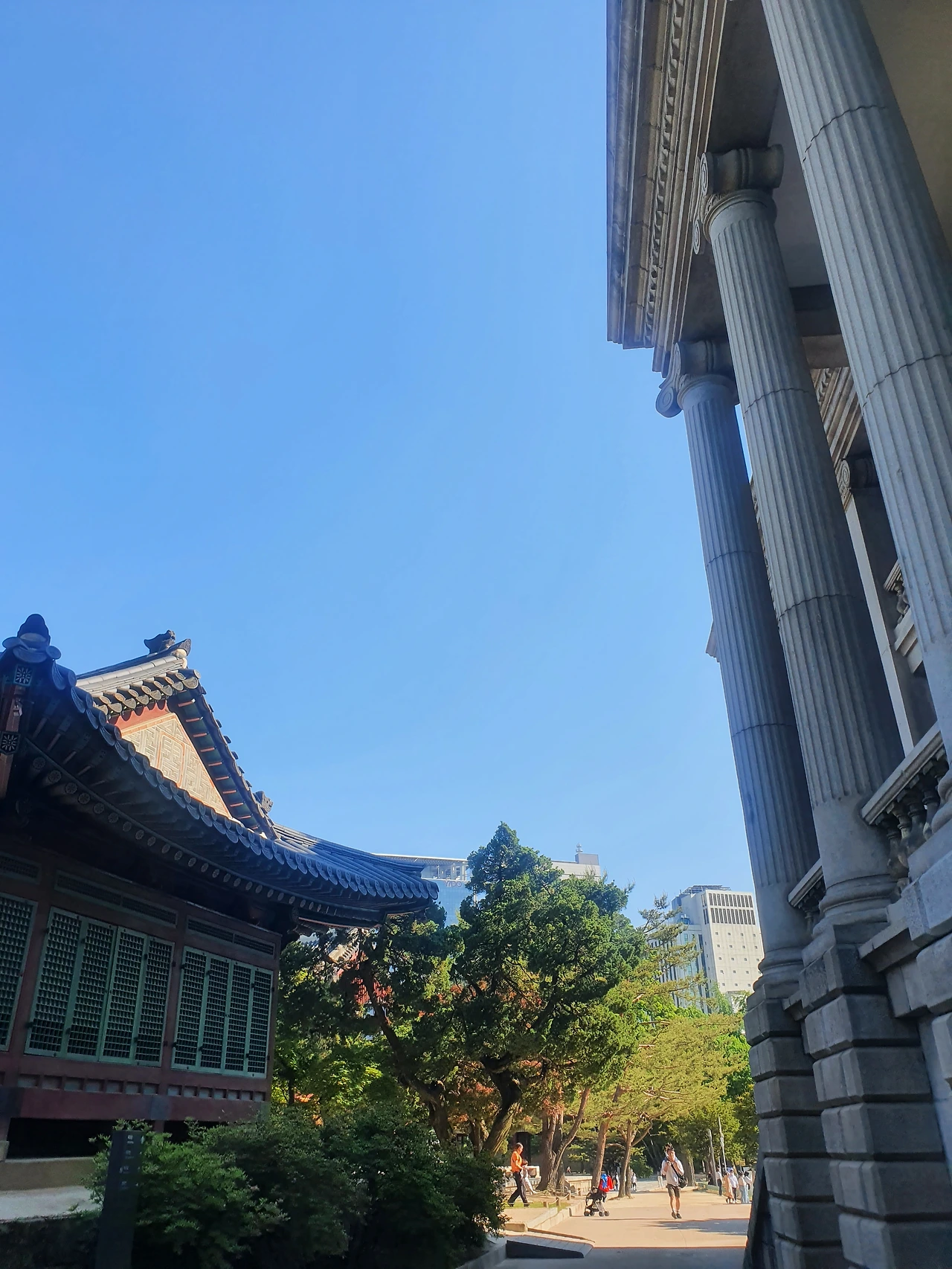 콘크리트들에 둘러싸여, 그 안에 또 콘크리트를 품고 있는 이 고급 옛집은 무슨 마음일까? 이 부조화 속에서도 천연덕스럽게 해맑은 이 옛집. 나는 이곳에서 편안함을 느낀다. 이게 바로 부조화의 정점이랄까. 나를 무의식적으로 덕수궁에 이입하게 된다. 덕수궁처럼 되고 싶어서
