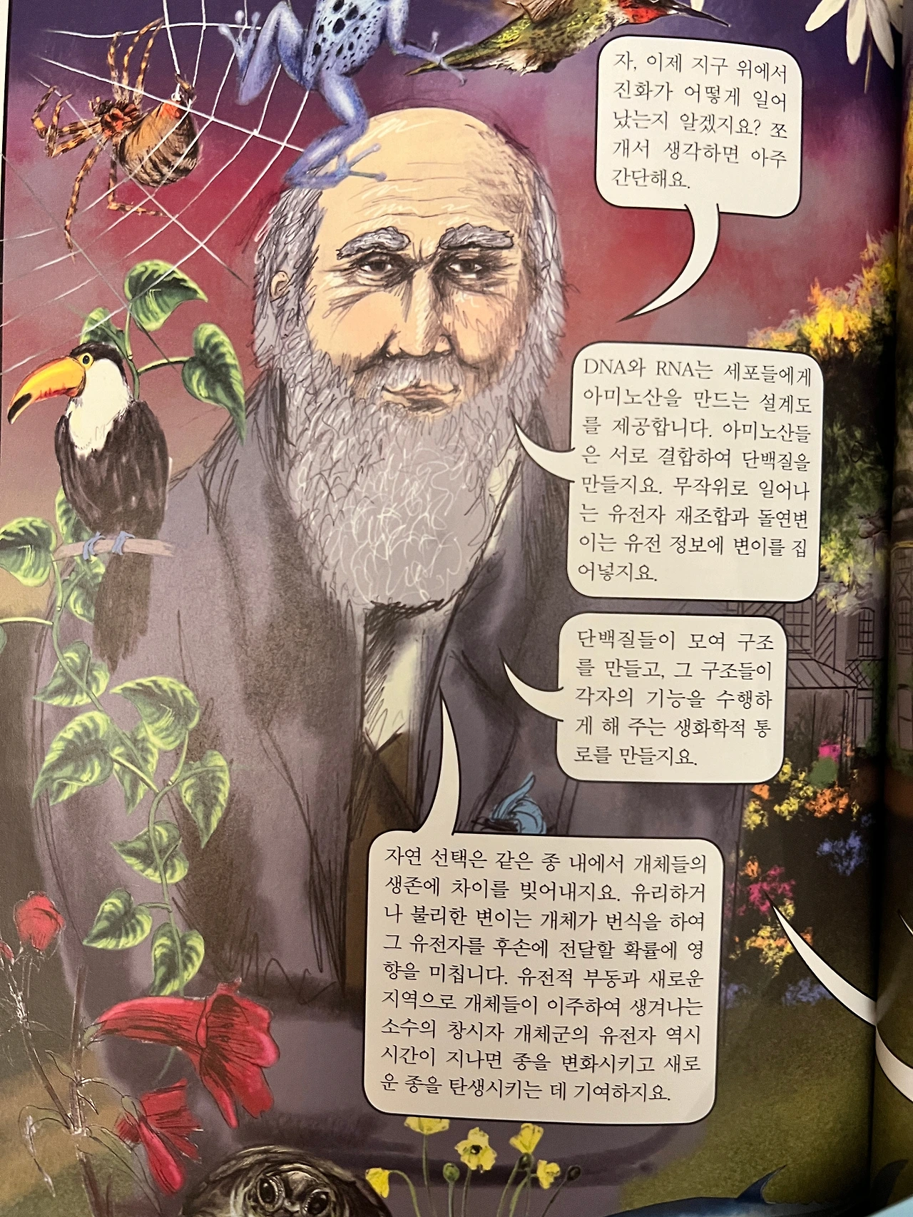 이 대목에서 큰 웃음이라는 선물을 받았다. 초반의 당혹감은 잊고 이 일러스트레이터의 유머감각이 또 발휘되는 곳을 찾는 데 주력하며 책을 읽기 시작했는데, 이후부터는 책의 내용에 충실한 그림들이다 보니 동물들이 등장하는 경우가 대부분이라 다윈의 아이디어가 도약을 하는 순간을 포착한 유쾌한 그림 같은 것은 더 이상 등장하지 않았다. 그리고 볼수록 이 일러스트레이터가 인간을 동물의 한 종으로 충실하게 그리고 있다는 확신이 들었다. 책에 등장하는 인간이 아닌 동물들의 그림은 대부분 아름답다. 민둥한 얼굴에 드문드문 털이 난 인간은 사실 매우 추악한 모양새를 지녔다. 공평한 눈으로 보면 이의를 제기할 수 없을 것이다.