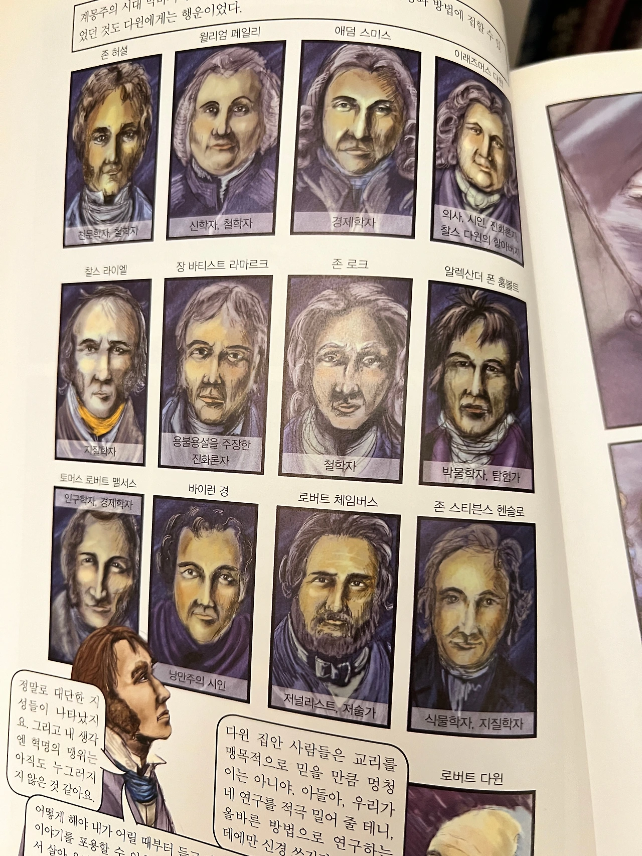 득템에 기뻐하며 의기양양하게 집에 돌아와 자세히 보니 표지에 손때가 상당하다는 생각이 들었다. (헌책만 사지만 때 탄 책 안 좋아함) 그러나 역시 흔치 않은 판형과 꼼꼼한 제본, 과하지 않으면서 고급스러운 하드커버의 마감 등 만듦새가 매우 훌륭한 책이라는 생각에는 변함이 없었는데… 책을 읽어볼까 해서 펼치는 순간, 그림체에 흠칫 놀라고 말았다. 다윈은 뭐랄까 생김새로 너무 많은 공격을 받아온 편이라 (늘 그렇듯 유인원과의 유사성에 집중해서 조롱하는 편) 이 책도 은근히 다윈(과 그의 가족들까지) 조롱하려는 의도가 있는 것이 아닐까 의심하려던 차에