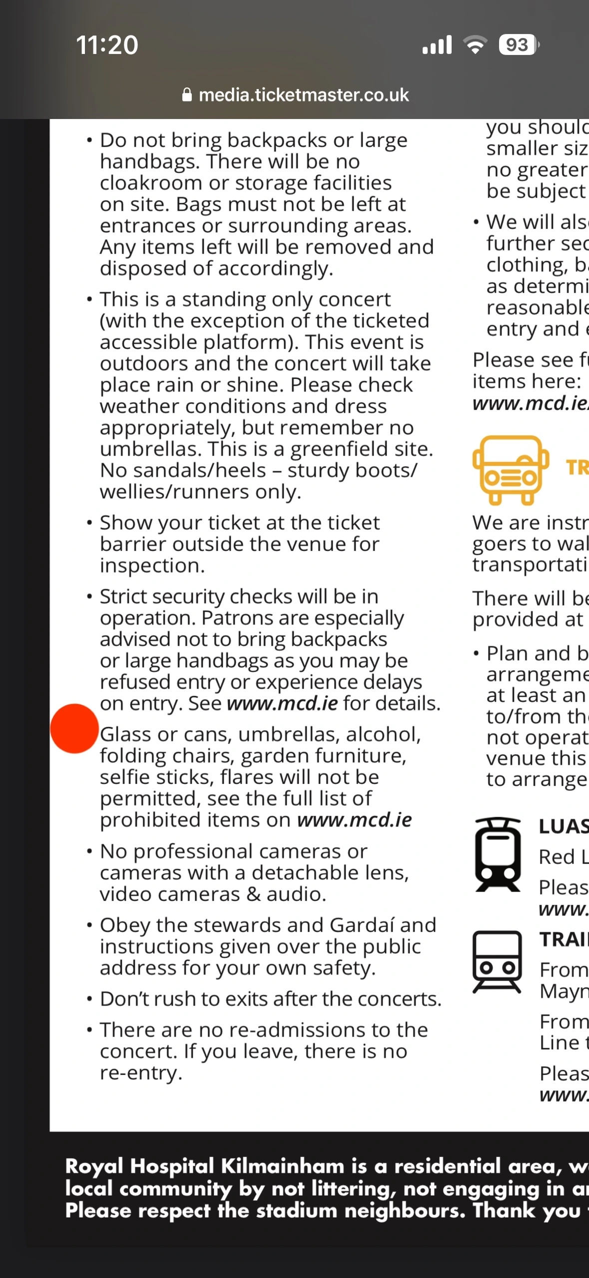 가장 어이가 없었던 안내사항은 Tiesto(티에스토)의 공연으로 Royal Hospital Kilmainham에서 했던 야외공연이었다. 아일랜드 야외공연은 하루에 심하면 열 번적어도 세 번 이상은 비가 내리는 것을 우리 모두가 인지함에도 불구하고 이들은 우산을 가져오지 못하게 공지했다. 심지어는 가방도 A4 사이즈 크기를 넘지 못하게 공지하고, 가방검사를 실시한다고 적시했다.