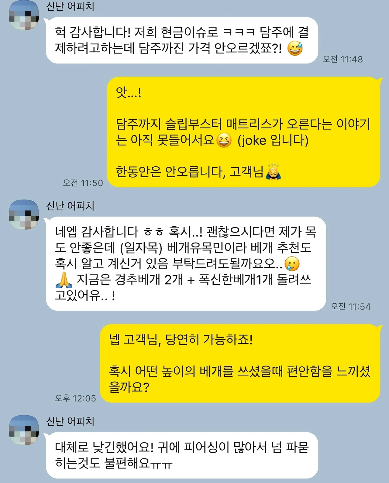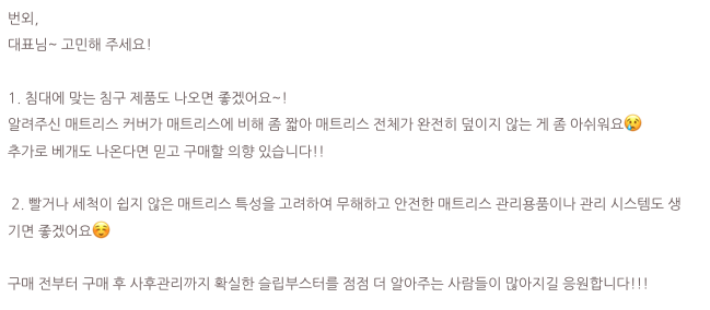 특히 디스크로 인해 고생하고 계시던 'S님'은 상담 초기부터 제품에 대한 이야기는 물론, 수면과 통증에 관한 깊은 이야기를 자주 나눠주셨던 분이었습니다. 이후 출시될 제품 아이디어에도 의견을 주실 만큼 저희 브랜드를 깊이 이해하고 응원해주셨던 분이였죠.