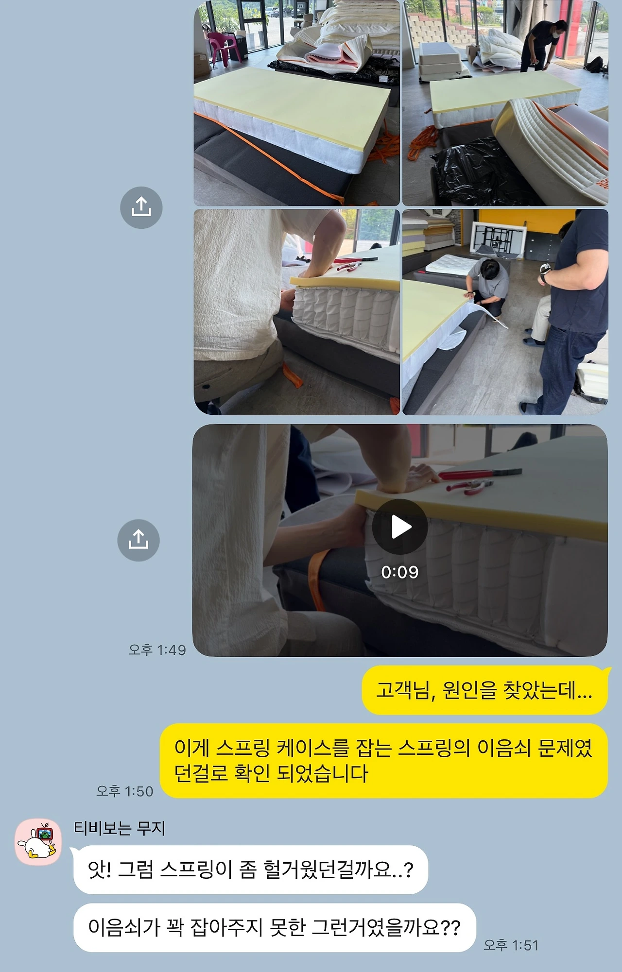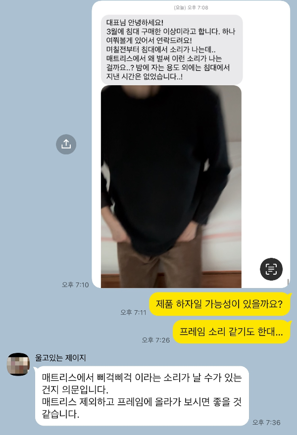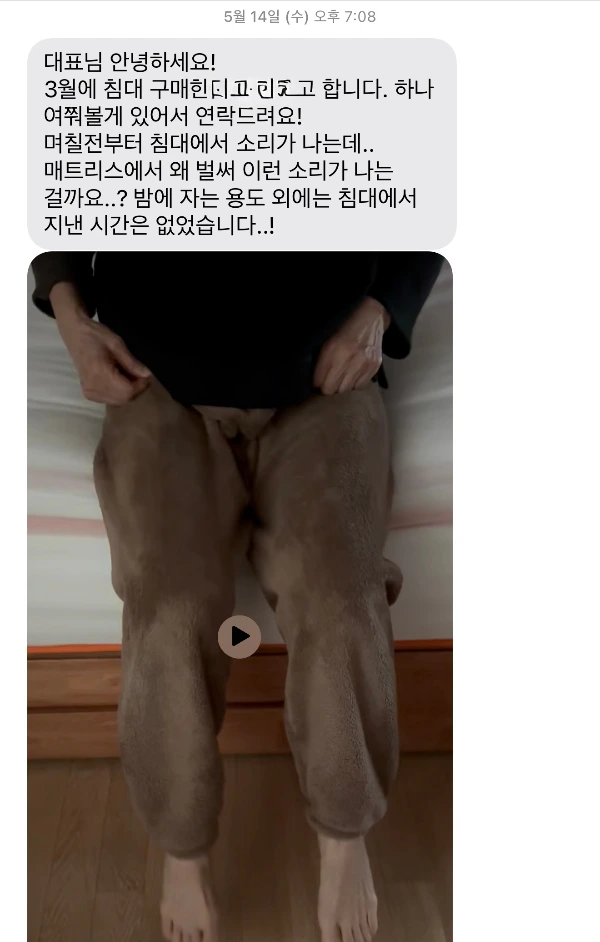 고객께서 보내준 영상을 공장과도 공유했지만, 공장 역시도 수천 수만개의 매트리스를 출하했지만, 1~2개월만에 스프링에서 소리가 나는 경우는 없었다며 프레임 쪽 가능성에 무게를 두었습니다.