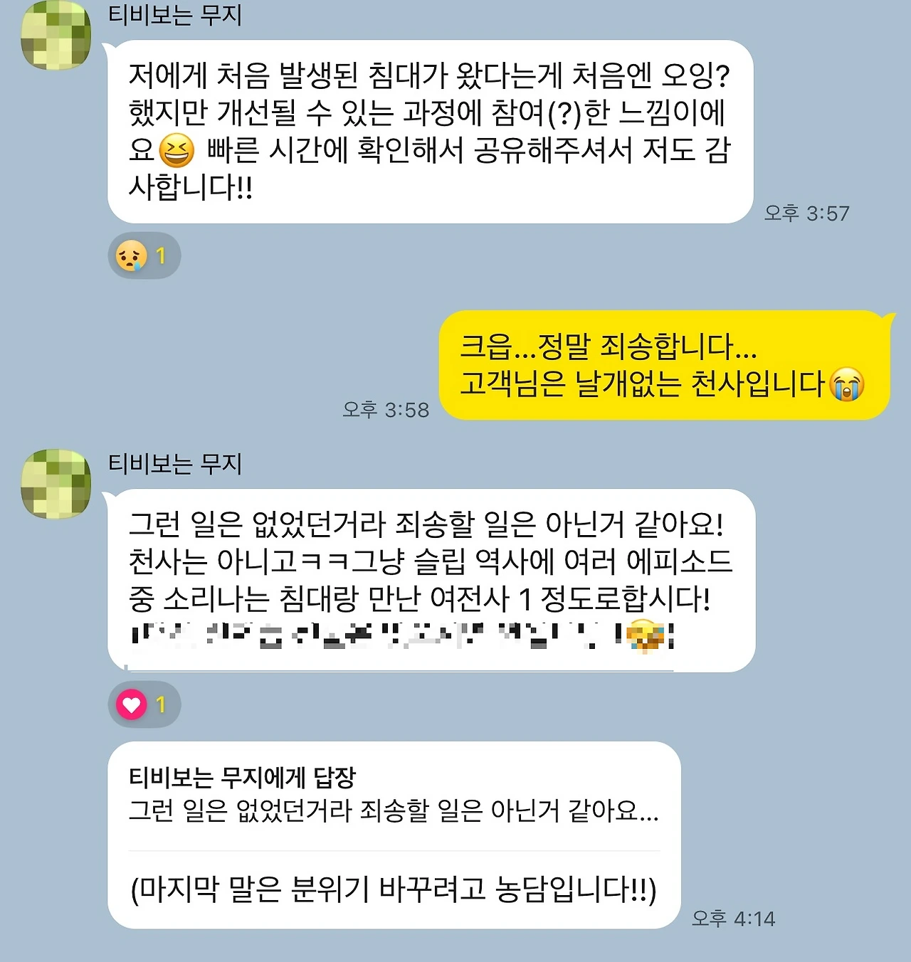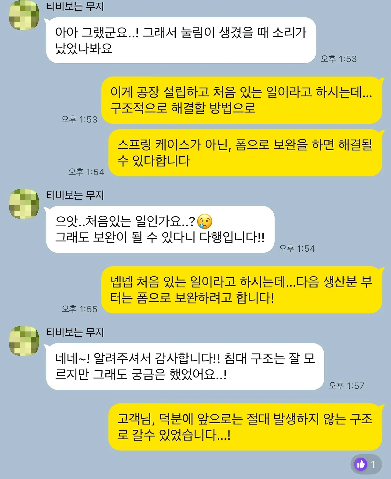 S님은 오히려 이번 이슈가 본인에게 일어나서 제품이 개선되는 과정에 참여한 느낌이라며, 상세하게 알려줘서 감사하다는 답변을 해주셨습니다.