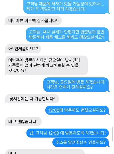 현장에서 고객님께 사과드리고, 바로 새 제품을 보내드리기로 약속했습니다.