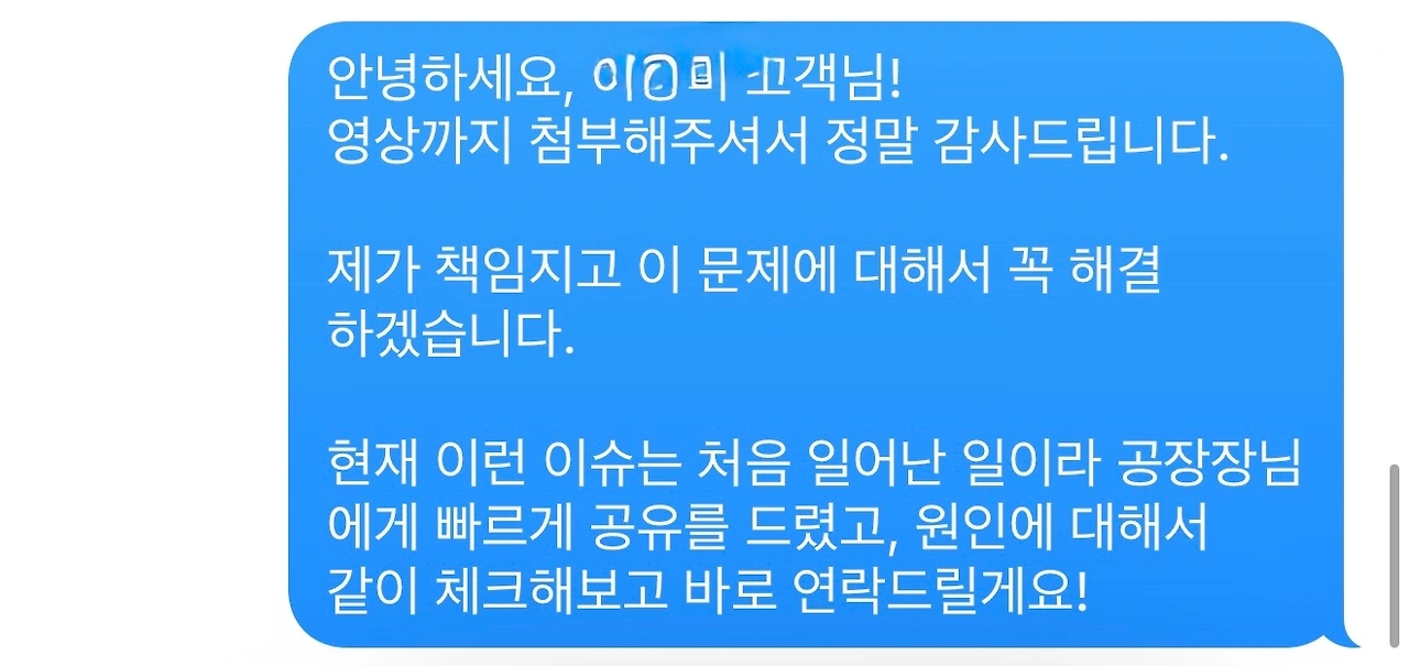 그리고 해당 제품은 회수한 뒤 공장으로 가져가 문제 원인을 명확히 파악하고 공유드리겠다고 약속드렸습니다.