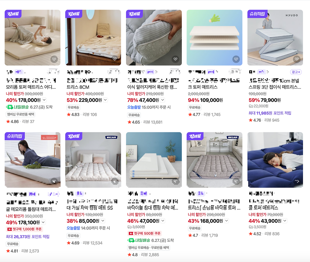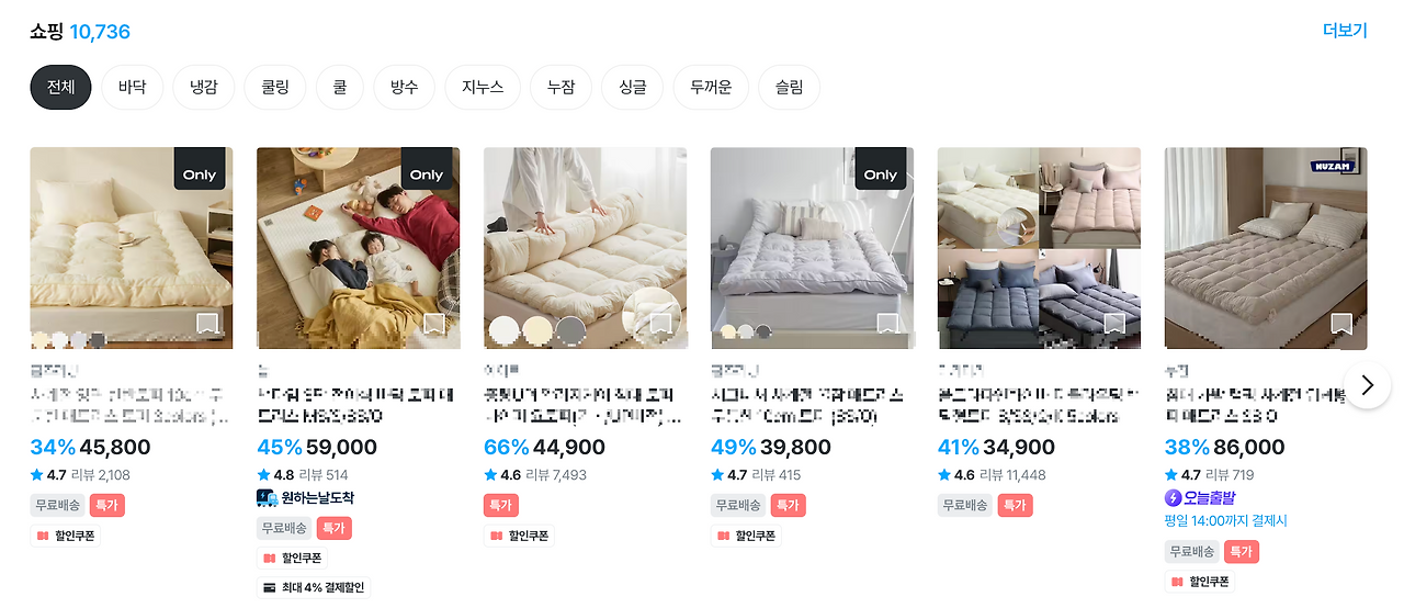 네이버쇼핑 / 오늘의집의 베스트 셀러 토퍼의 가격대는 평균 10만원 미만.