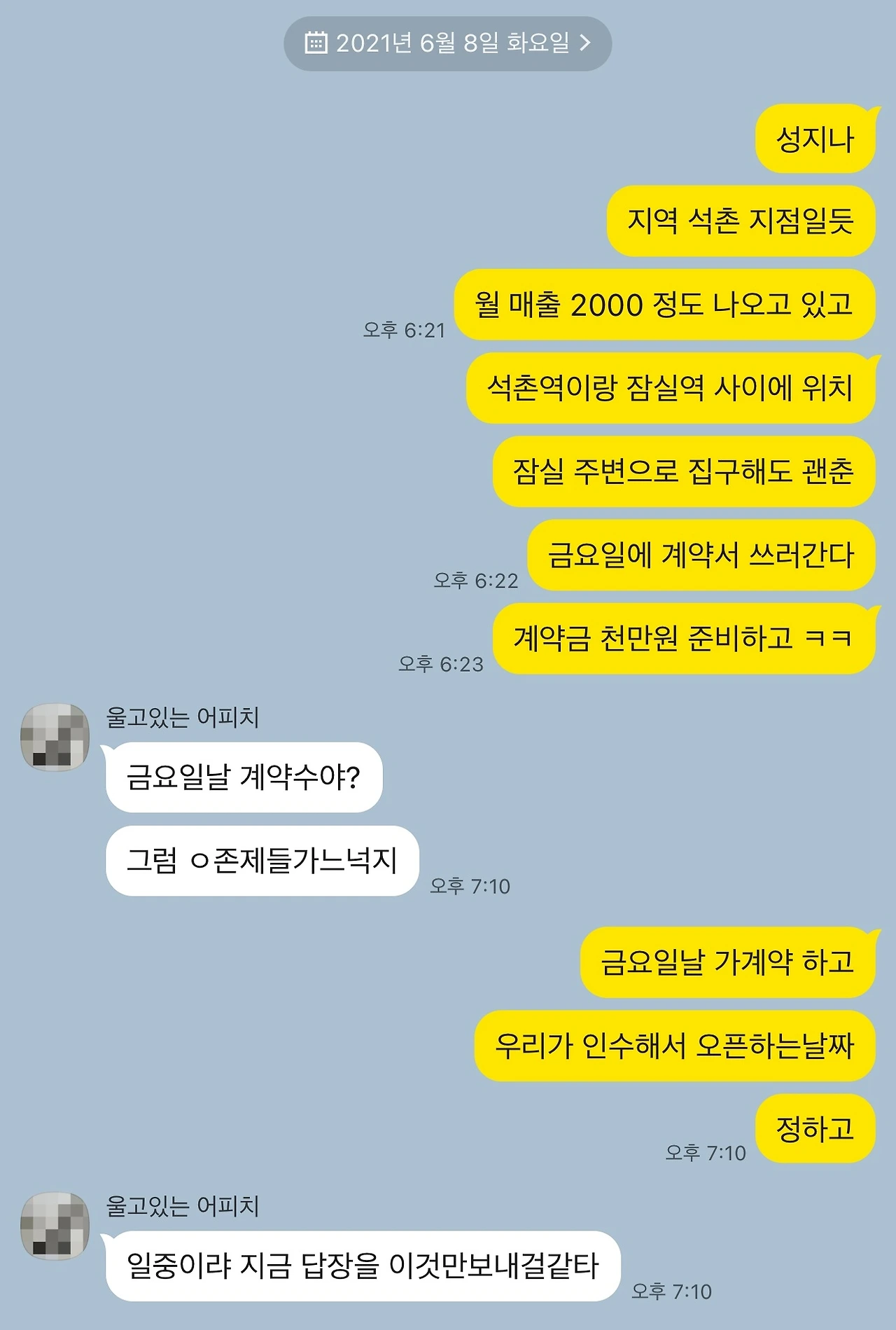 계속 연락을 해오던 형님께 연락을 드려 치킨프랜차이즈 조건을 받았고, 외식업 운영 경험이 없었기에, 자리가 잡힌 본사가 운영하고 있는 직영점들을 인수하는 방식으로 계약을 하기로 했었다.