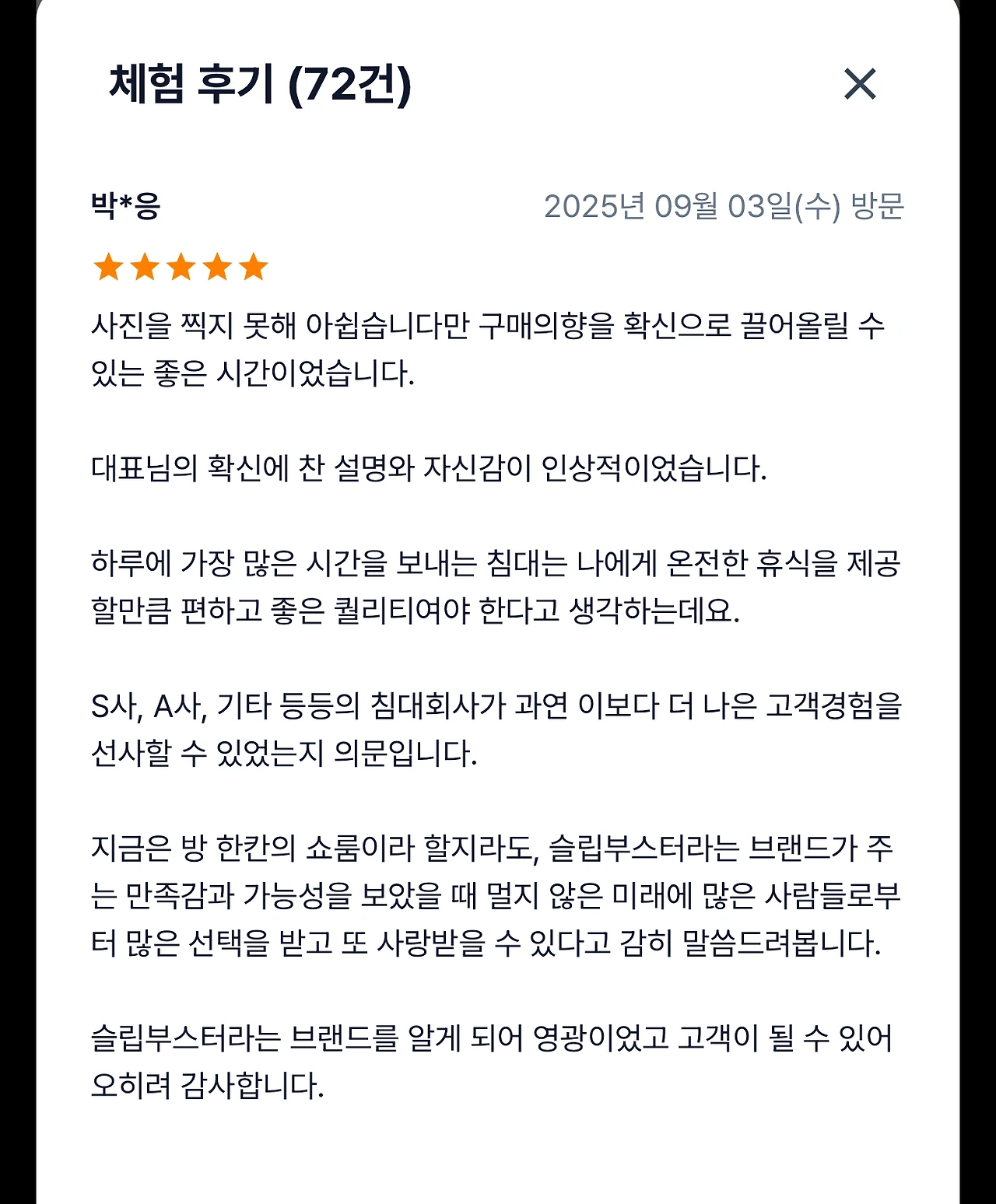 9개월간 슬립부스터 브랜드를 운영하며, 고객님들을 만나면서 가장 크게 배운 건 한 가지였습니다. 강하게 영업하지 않아도, 진심은 전해진다는 것.