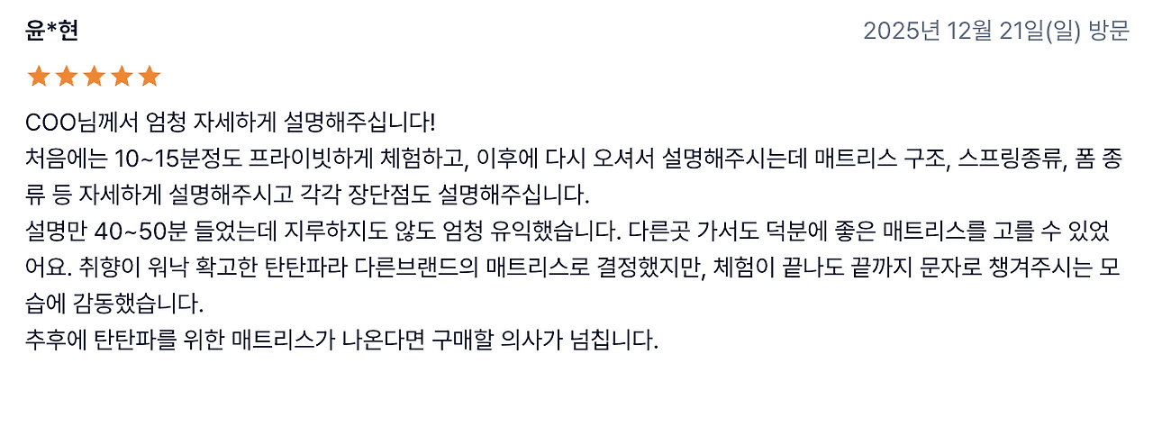 - 약 20% “나는 더 탄탄한 매트리스가 좋다”며 느낌 불만족을 표시한 경우