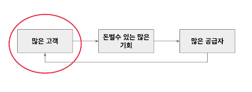 플랫폼 비즈니스는 많은 고객들이 있어야 돈을 벌 수 있는 기회가 만들어고, 그래야 많은 공급자들을 모을 수가 있다.