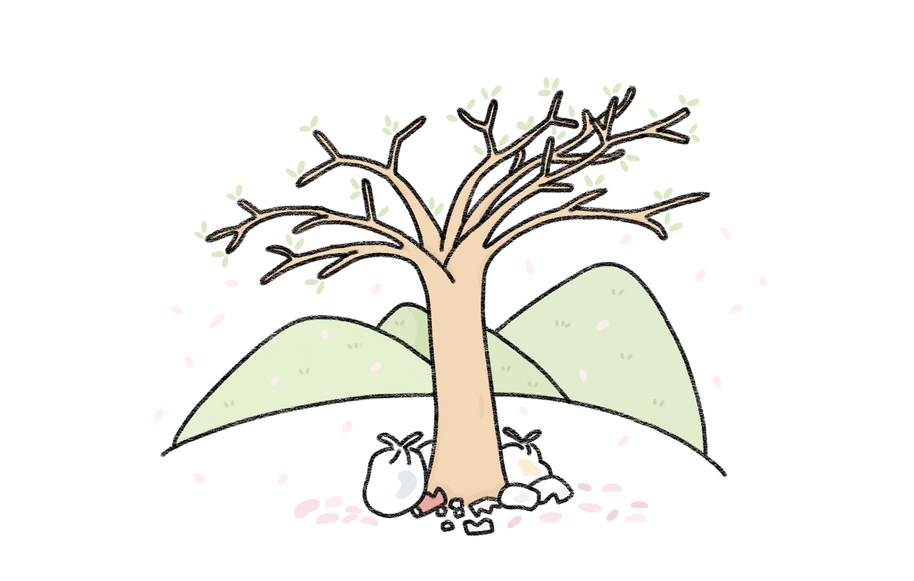큰 마대 포대 하나를 받고 도로를 따라 갓길 청소를 시작했다. 카페 앞이나 식당 앞 주차장 도로변은 그야말로 쓰레기 천지였다. 발밑에 쓰레기가 가득한 자리에도 우뚝 서 있는 한 그루의 벚나무!