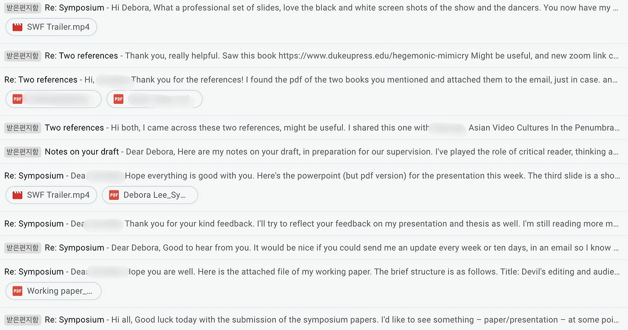 그 과정에서 지도교수님과의 또 한 번의 미팅을 가졌다. 미팅 전에 심포지엄 위원회에 제출한 워킹 페이퍼와 준비하고 있던 발표 자료를 공유해드렸는데, 지도학생이 나 혼자만 있는 게 아니다 보니 다 읽는데 시간 좀 걸릴 수도 있을 것 같아 따로 요약본도 보내드렸다. 하지만 이는 기우였고, 교수님은 하루 만에 다섯 명의 지도학생들이 보낸 페이퍼들을 다 읽으셨다. 그것도 하나하나 꼼꼼히. 교수님은 워킹 페이퍼에 대한 피드백을 A4 용지 두 장을 꽉 채운 분량으로 미팅 전에 미리 주셨고, 미팅에선 그 피드백들에 대해 구체적으로 설명해 주셨다. 그리고 발표 자료에 대해서도 어느 부분은 제외시키고, 어느 부분은 좀 더 구체화시키면 좋을지 함께 이야기하며 도움을 받을 수 있었다.