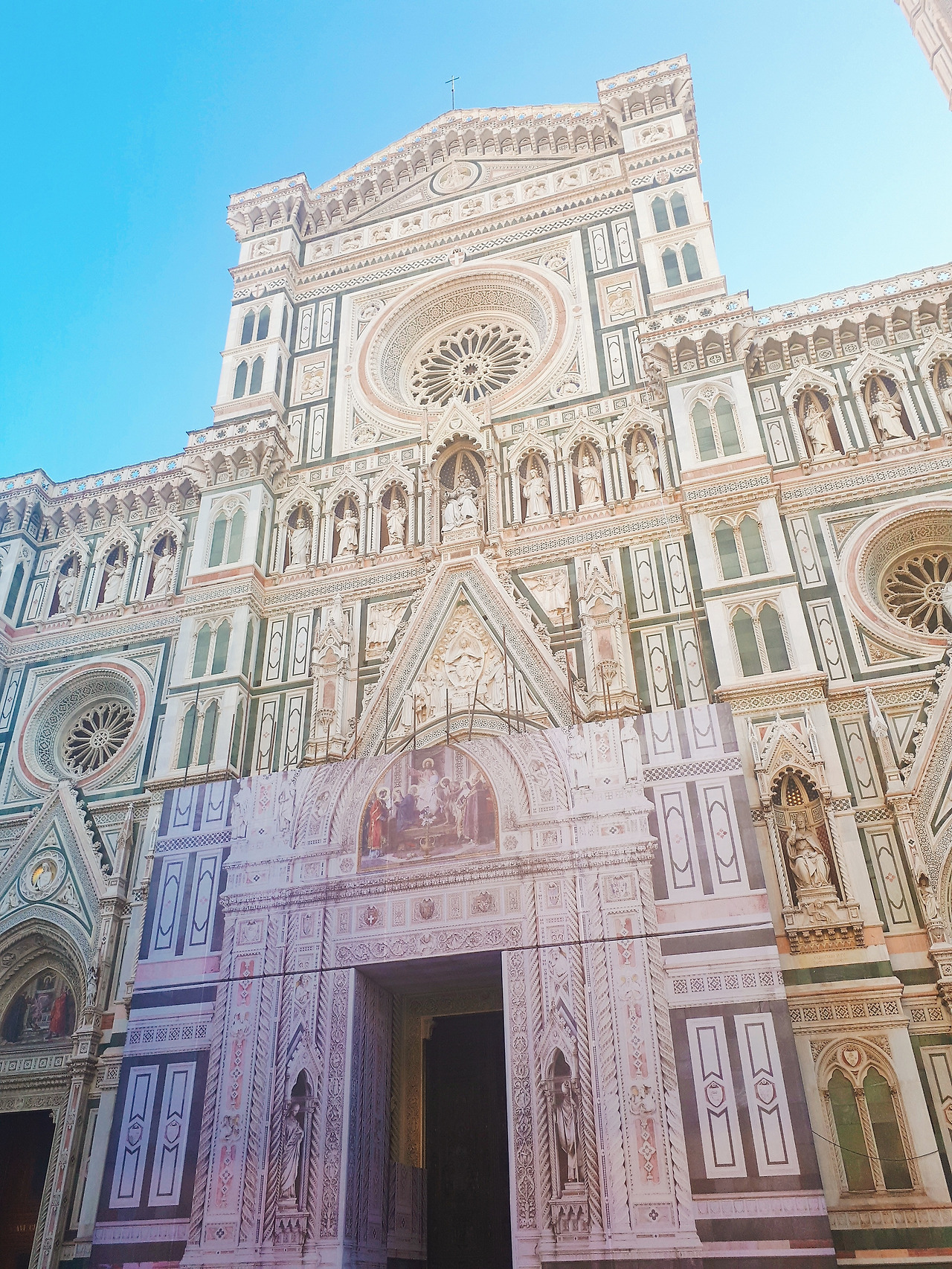 든든히 배를 채우고 피렌체를 둘러보기 시작했습니다. 가장 먼저 간 곳은 두오모 성당이었습니다. '냉정과 열정 사이'라는 일본 영화에서 나온 촬영지라는 사실만 확인하고 두오모 성당을 갔는데 좀 많이 놀랐습니다. 생각보다 훨씬 큰 규모가 성당이라는 것과, 천장이 제가 좋아하는 돔 형태라는 것에 가장 놀랐고 결정적으로 수리 중인 입구에 건물 외벽 무늬의 천을 댄 것에 놀랐습니다. 처음에는 저게 뭐지?라고 생각했는데 돌이켜 생각해 보면 괜찮은 아이디어인 거 같습니다. 일반 건물이면 모를까 관광객에게 유명한 명소인데, 공사장 모습을 그대로 보이는 것보다 해당 건물 외벽 천을 대면 관광객들의 불편함이 줄어들 것으로 보였습니다.