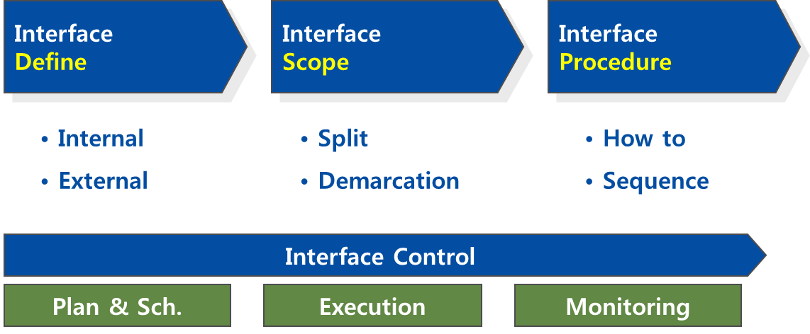 원활한 Interface 업무를 위해서는 반드시 프로젝트 초기에 발주처와 범위, 자료를 주고받는 절차 그리고 제공 기한 등을 사전에 정해야 합니다. 프로젝트 마지막까지 연결되기 때문에 초기부터 제대로 정하지 않으면 프로젝트 진행 도중 많은 문제가 발생되기 때문인데 이는 대부분 비용과 일정 지연으로 연결되는 경우가 많습니다. 실제로 프로젝트를 수행하다 보면 자료를 주고받는 일정 차이로 인해 문제가 발생하는 것을 자주 볼 수 있습니다. 이 때문에 발주처에서도 Interface Manager를 선임하여 별도의 조직으로 운영하는 것입니다.