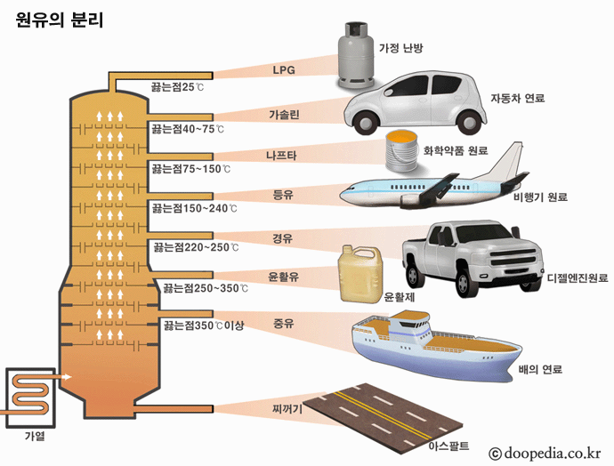 나프타(Naphtha), 디젤(Diesel), 벙커씨유(B-C) 등으로 분리하는 과정으로, 용도에 따라 자동차 등