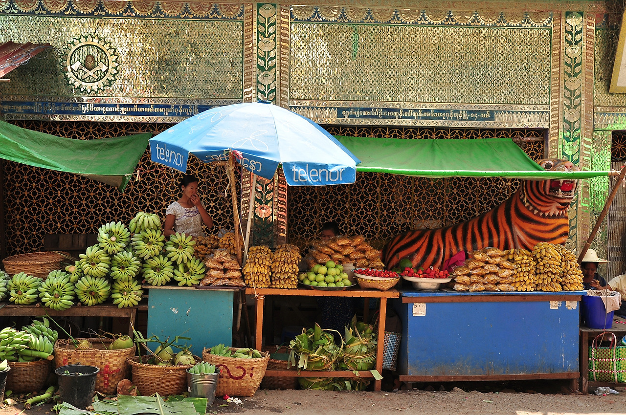 입구의 노점상 배경 색과 무늬, 호랑이 상이 이채롭습니다. 진열된 바나나의 모습도 재미있습니다.