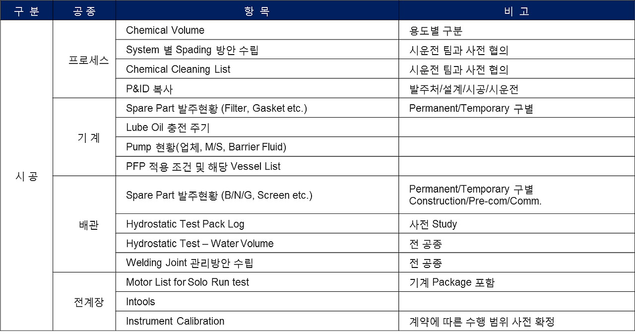Field Engineering Team의 주요 업무는 시공(Construction) 및 시운전(Commissioning) 지원이라고 앞서 언급하였습니다. 따라서 Field Engineer는 현장에서 필요한 자료들을 사전에 잘 준비해서 나가야 합니다. 사전에 준비할 내용은 프로젝트 특성에 따라 다르기도 하지만 시공 조직이나 시운전 조직의 역량에 따라 많은 차이가 나기도 합니다. 각 조직에서 잘 준비하면 좋지만 그렇지 않다면 엔지니어들이 미리 준비해야만 현장에서 불필요한 시간과 비용을 지급하는 것을 막을 수 있습니다.