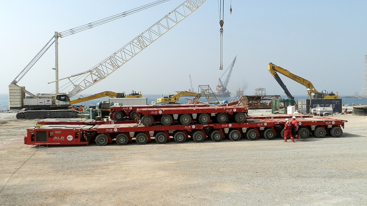 육상에서는 주로 SPMT(Self-propelled Modular Transporter)라고 하는 장비를 사용하는데, 일반 건설 현장에서 사용되는 트레일러나 트랜스포터와는 많이 다릅니다. SPMT는 이름에 나타난 것처럼 본체의 높이를 조절할 수 있는 것은 물론, 바퀴마다 회전 각도를 따로 조절할 수 있어 커브길에서도 안전하게 운송할 수 있는 특수장비입니다. 때로는 구조물의 무게나 크기에 따라 SPMT 두 대를 연결하여 동시에 사용하기도 하는데, 이런 경우에는 매우 세밀한 조정이 필요합니다. 이렇게 SPMT는 아무나 다룰 수 없다 보니 ALE 등 운송 전문회사에 의뢰하는 것이 일반적입니다.