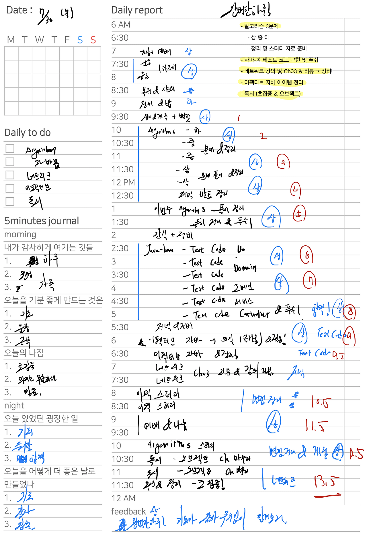 아침 6시 반 기상 - 기도 및 간단하게 아침 식사 - 알고리즘 혹은 독서 - 오전 8시 운동 약 2시간 - 운동 후 밥 먹고 연구실 가서 공부 시작 - 점심 - 오후 공부 (or 연구) - 저녁 - 저녁 공부 및 스터디 미션 - 취침.