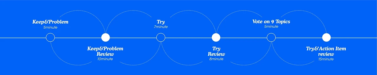 앞서 미시적인 관점에서의 프로젝트별 회고를 마쳤고, 거시적인 관점에서 스켈터랩스와 스켈터랩스 디자인 팀을 주제로 회고를 진행하고자 했습니다. 이에 KPT 회고 방식을 도입해 워크숍을 진행했습니다. KPT 회고는 짧은 시간 안에 서로의 생각을 공유하면서 실행할 수 있고 측정 가능한 목표를 도출할 수 있는 방법으로 가장 효율적이라고 판단했기 때문입니다.