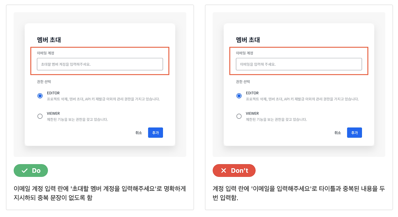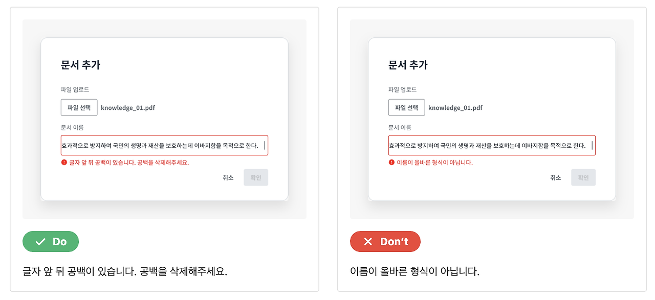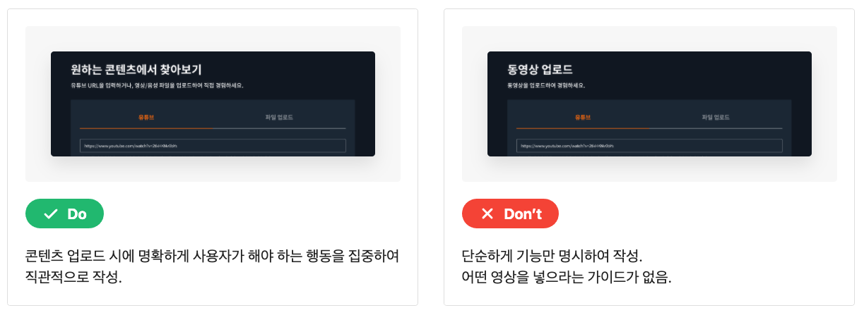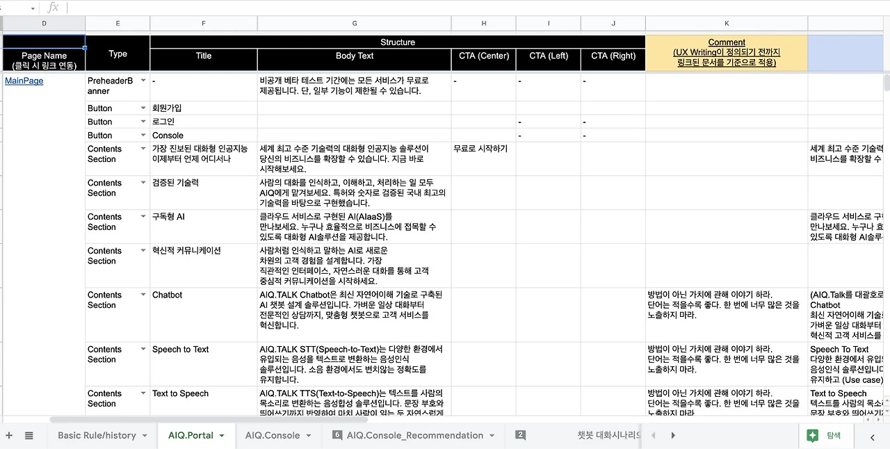 문장을 한 곳에 모아서 검토해보니 여러 명이 동시에 페이지를 디자인하다 보면 사람들마다 각자의 언어 표현이 글에 녹을 수 있기 때문에 동일한 기능이어도 다르게 표현하고 있는 문제점들이 한 눈에 보였습니다. 예를 들어 같은 기능에 ‘-해주세요.’ 혹은 ‘-하세요’ 등과 같이 다르게 표현하는 경우도 있었습니다.